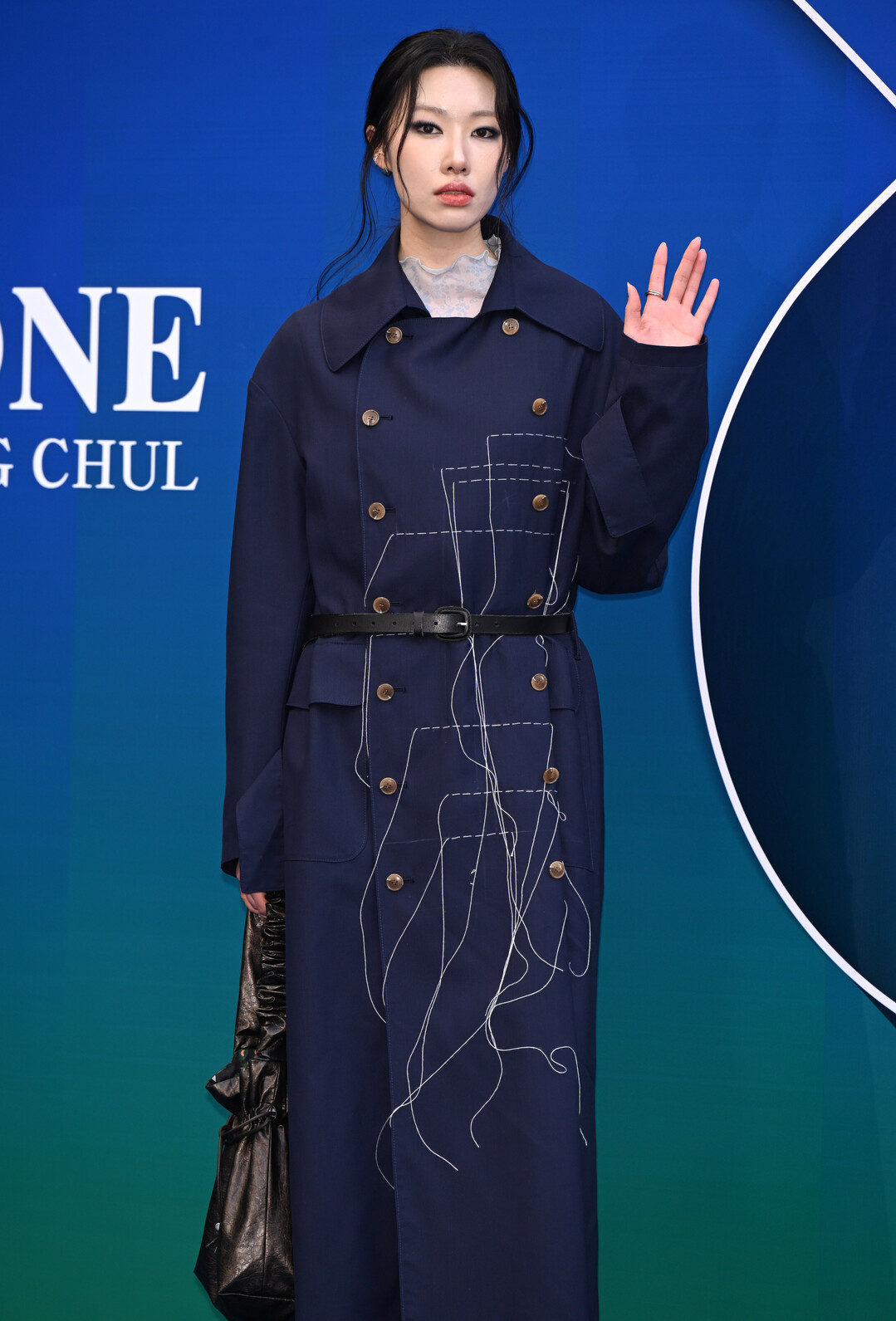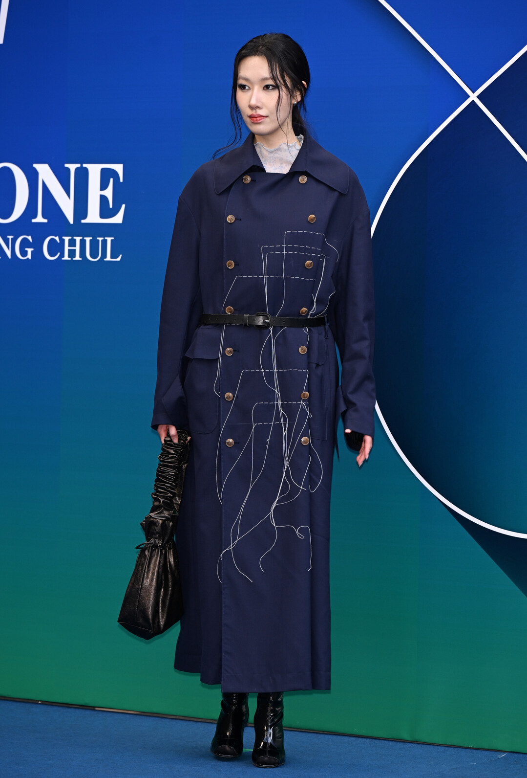 최해희가 선택한 의상은 박종철 디자이너의 시그니처 네이비 트렌치코트였다. 이 코트의 가장 큰 특징은 전면에 화이트 실로 수놓아진 추상적 라인 드로잉이었다. 마치 캔버스 위에 자유롭게 그려진 드로잉처럼, 화이트 스티치는 코트 전체를 가로지르며 예측 불가능한 곡선과 직선을 그려냈다.