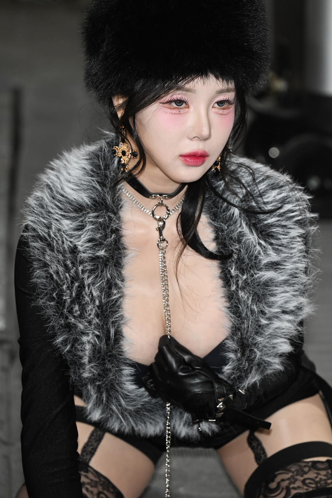 하의는 블랙 쇼츠에 레이스 디테일 가터벨트와 시어 블랙 스타킹을 매치해 도발적인 매력을 연출했다. 발목까지 올라오는 블랙 에나멜 플랫폼 부츠는 스터드와 체인 장식으로 펑크 무드를 강조하며, 초고굴 힐로 다리 라인을 길어 보이게 하는 효과를 냈다.