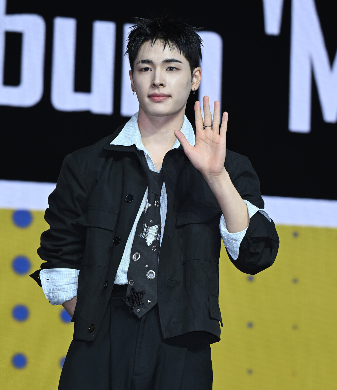 특히 이날 룩의 핵심 포인트는 넥타이였다. 블랙 베이스에 별 모양 스팽글 장식, 체크 패턴 패브릭 패치, 금속 링 장식 등이 더해진 독특한 아방가르드 넥타이를 착용해 단조로울 수 있는 블랙 룩에 강렬한 개성을 불어넣었다. 발에는 블랙 계열의 두툼한 청키 스니커즈를 신어 스트리트 감성을 완성했다.