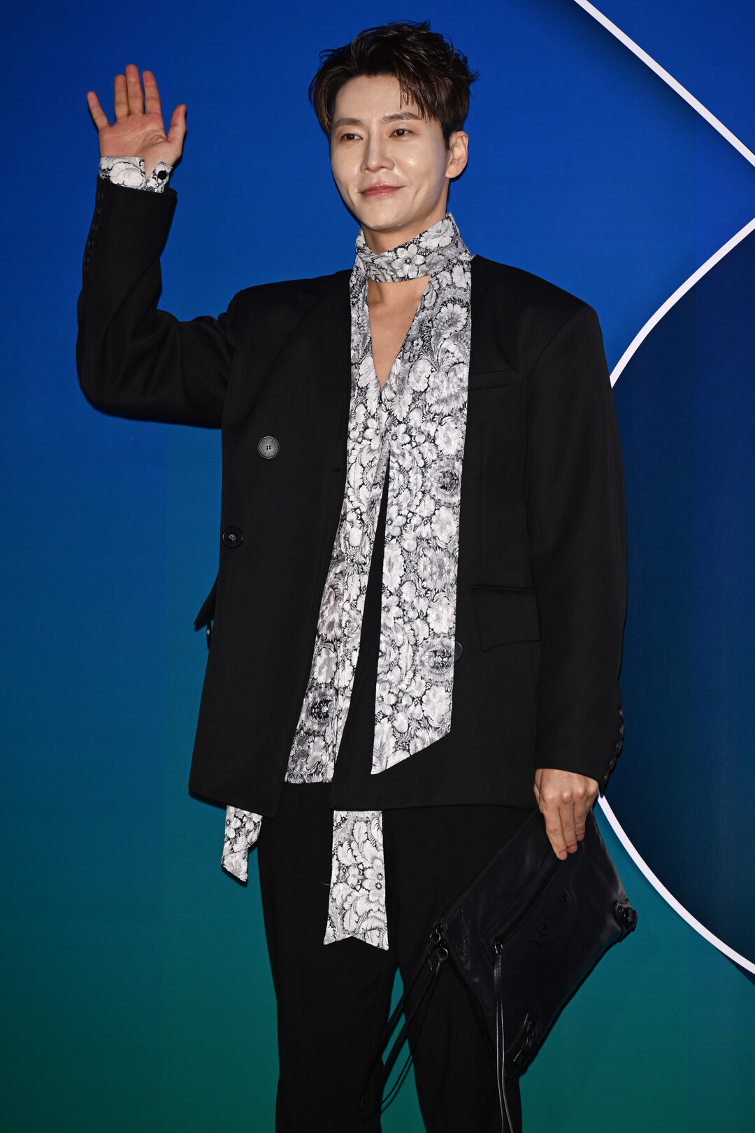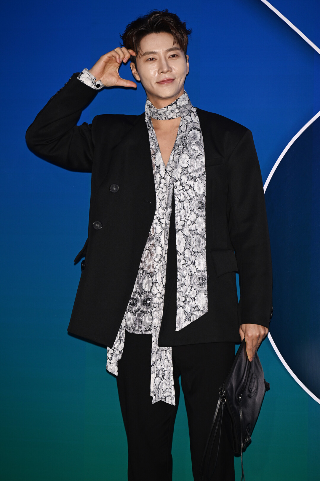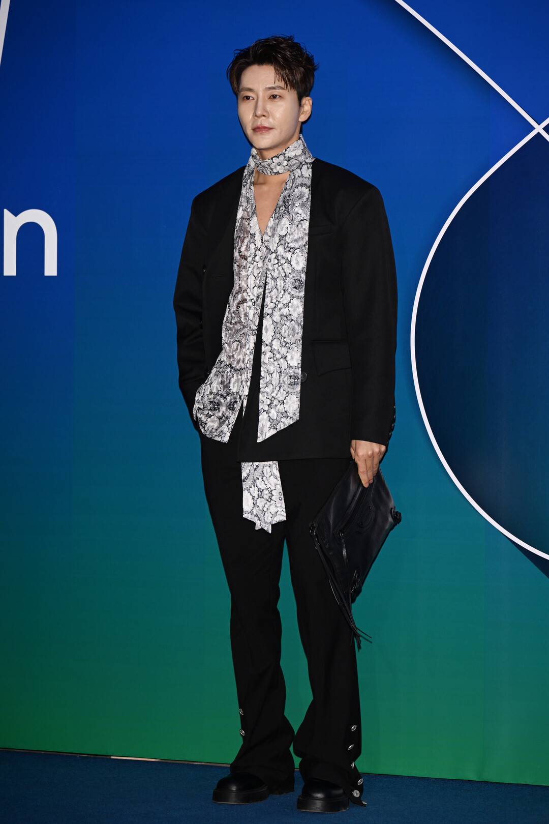 재킷 안에는 화이트와 블랙의 애니멀 프린트 스카프를 레이어드해 개성 있는 포인트를 더했다. 목 부분을 감싸는 하이넥 스타일의 스카프는 우아함을 강조했으며, 앞쪽으로 길게 늘어뜨린 스타일링은 자유롭고 아티스틱한 감각을 표현했다. 특히 스카프의 애니멀 프린트 패턴은 블랙 슈트의 미니멀함과 대비를 이루며 시선을 사로잡는 포인트로 작용했다.