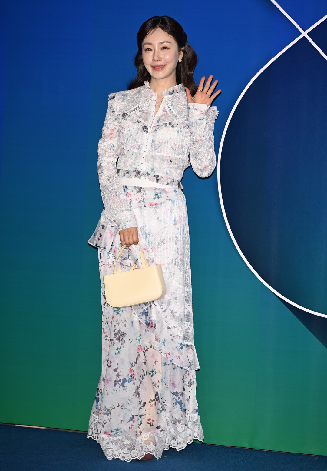 오나라는 화이트 베이스에 핑크, 블루, 그레이 톤의 플로럴 패턴이 수채화처럼 번진 레이스 롱 원피스를 선택해 로맨틱하고 우아한 분위기를 연출했다. 하이넥 디자인의 네크라인은 목 부분을 우아하게 감싸며 클래식한 느낌을 더했고, 앞쪽의 키홀 디테일은 은은한 섹시미를 표현했다.