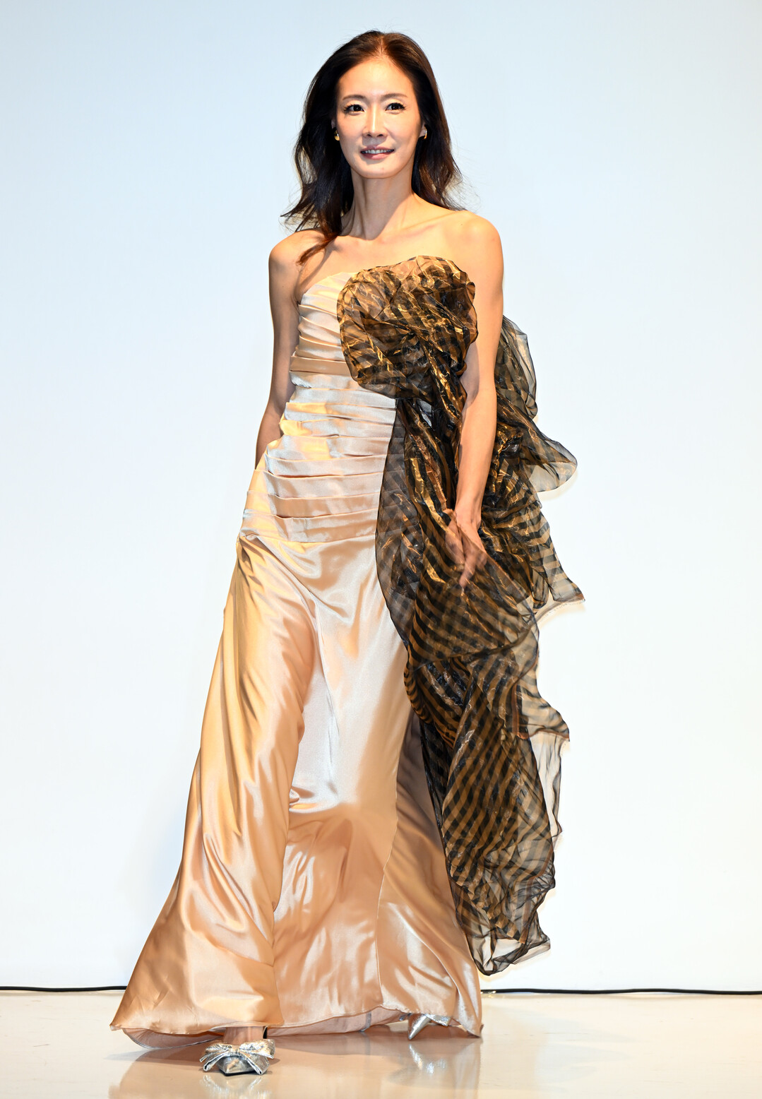 모델 김수인은 이날 샴페인 골드 컬러의 원숄더 새틴 이브닝 드레스를 착용해 시선을 사로잡았다.