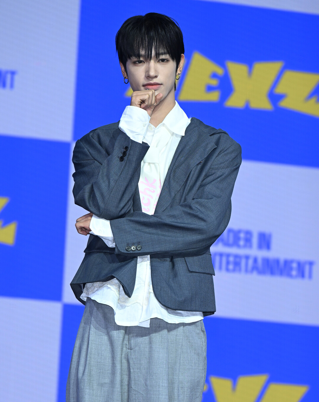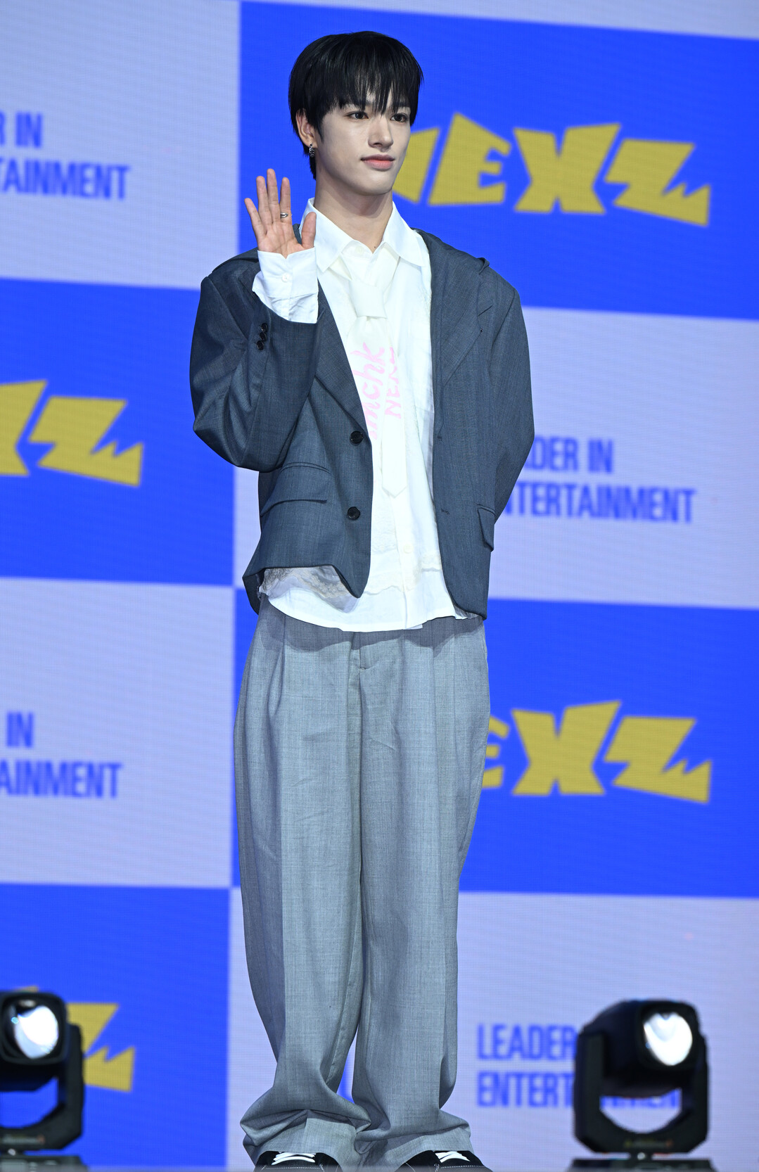 특히 셔츠에는 신보 타이틀 'Mmchk'와 그룹명 'NEXZ'가 핑크 컬러로 프린트되어 있어 룩 전체에 앨범 발매 기념 쇼케이스다운 위트와 포인트를 더했다. 하의는 같은 그레이 톤의 와이드 슬랙스로 통일감을 주었고, 블랙 스니커즈로 마무리해 단정함 속에 편안한 감각을 살렸다.