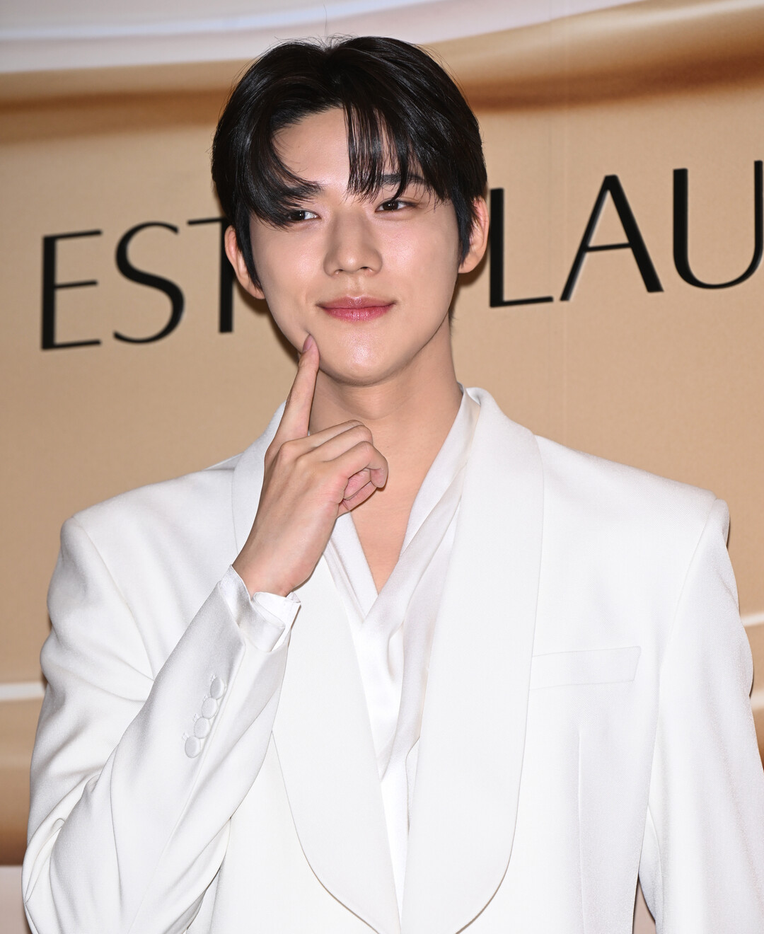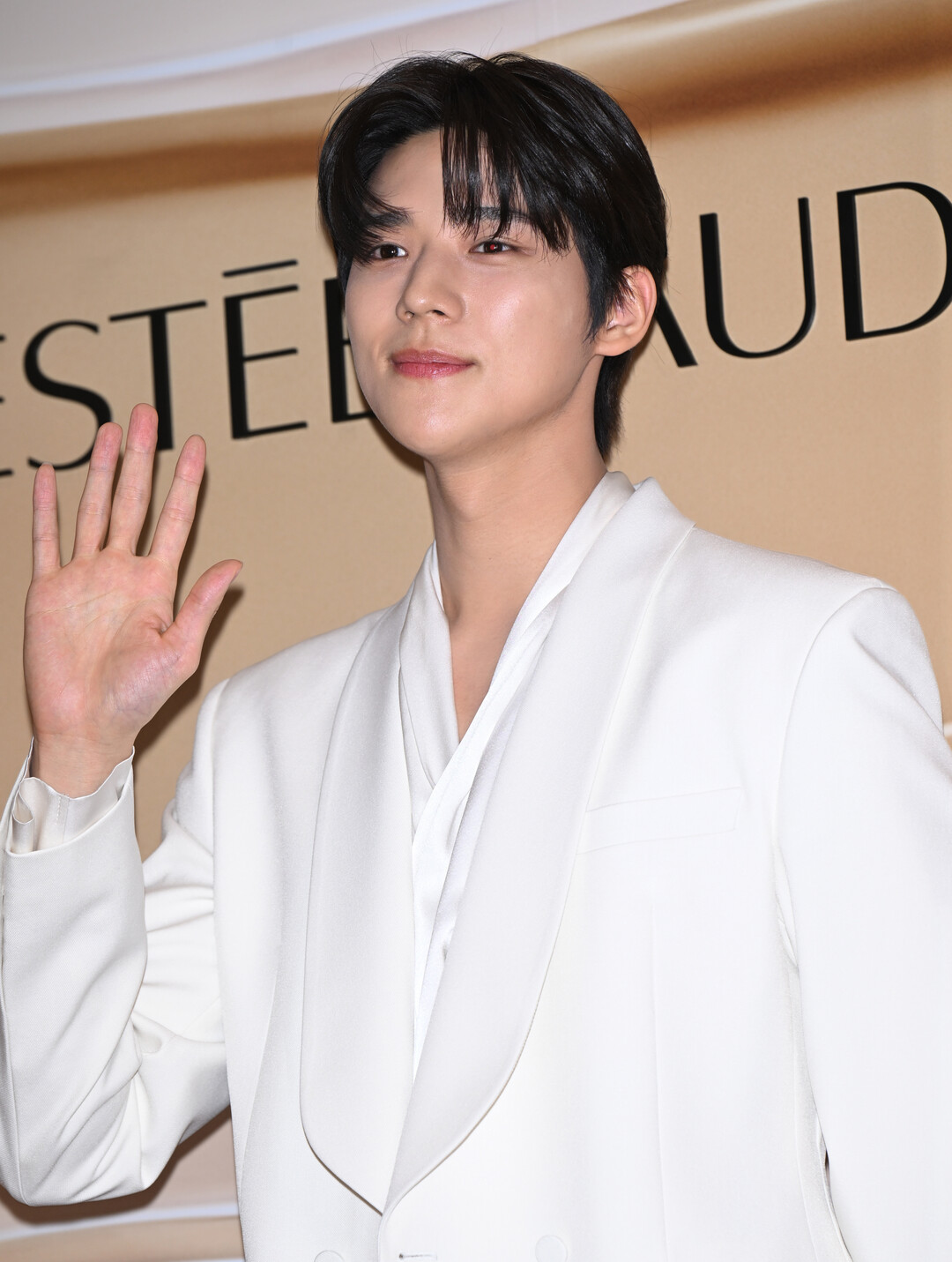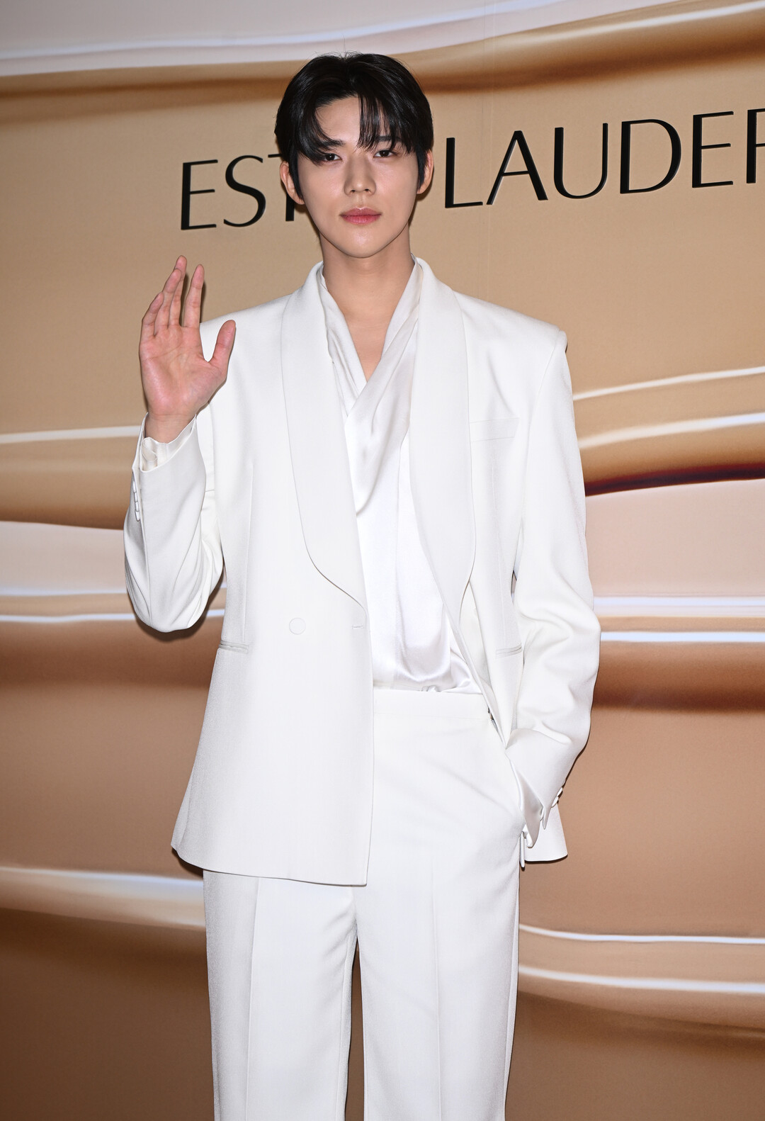 에스티 로더 로고가 새겨진 베이지 골드 배경 앞에 선 문상민은 순백의 수트 차림으로 등장해, 행사장 전체를 압도하는 존재감을 발휘했다. 카메라를 향해 특유의 절제된 미소와 여유로운 포즈를 선보이며 차세대 대세 배우로서의 위상을 다시 한번 확인시켰다.