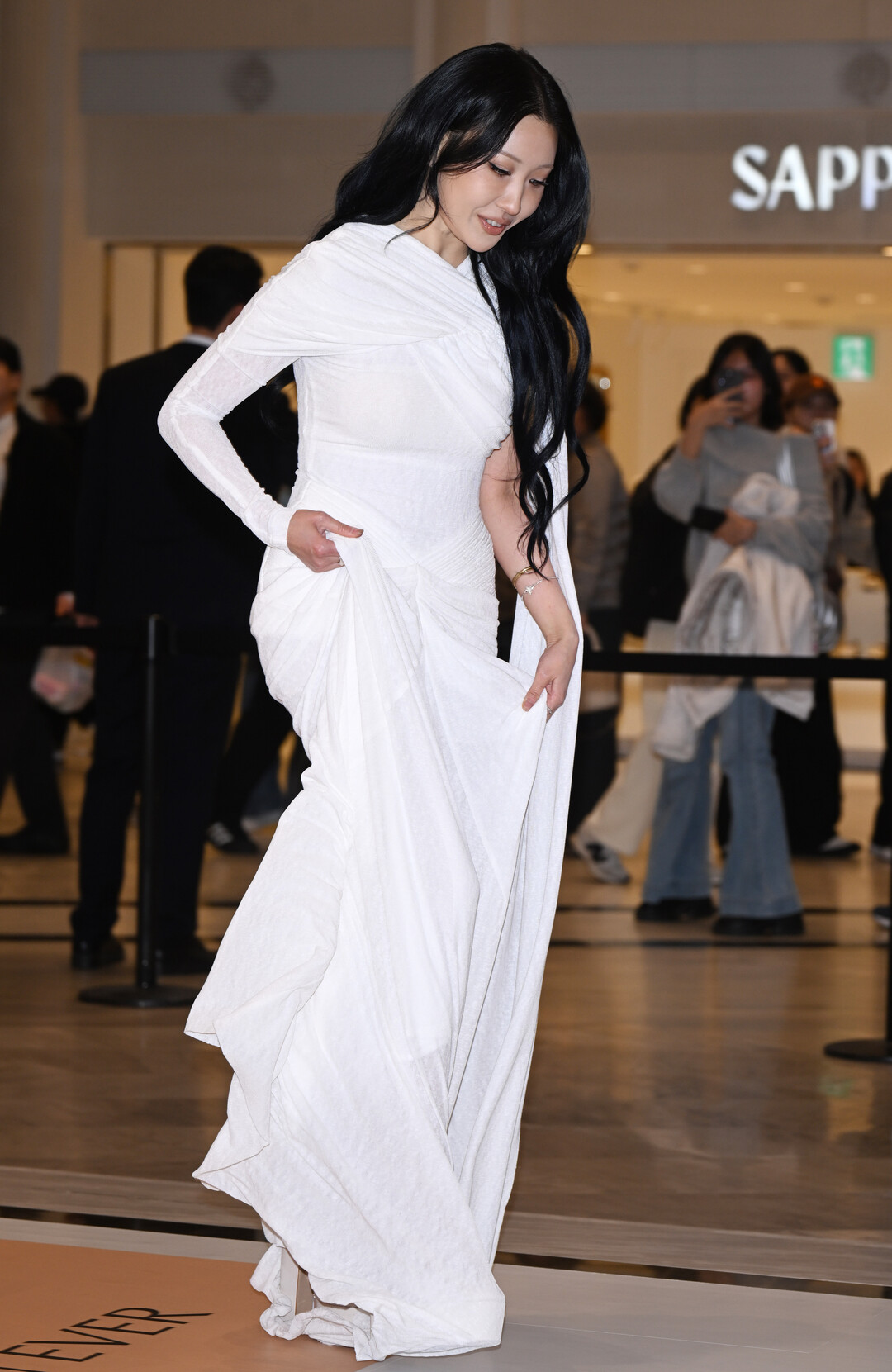 이날 스타일링의 핵심은 단연 '컬러의 대비'다. 순백의 드레스와 허리까지 내려오는 칠흑빛 웨이브 흑발의 조합은 그 자체로 강렬한 시각적 선언이었다. 검정과 흰색의 대비는 패션에서 가장 고전적이면서도 가장 강력한 조합으로, 이사배는 이 공식을 의상과 헤어라는 가장 큰 면적으로 구현해냈다.