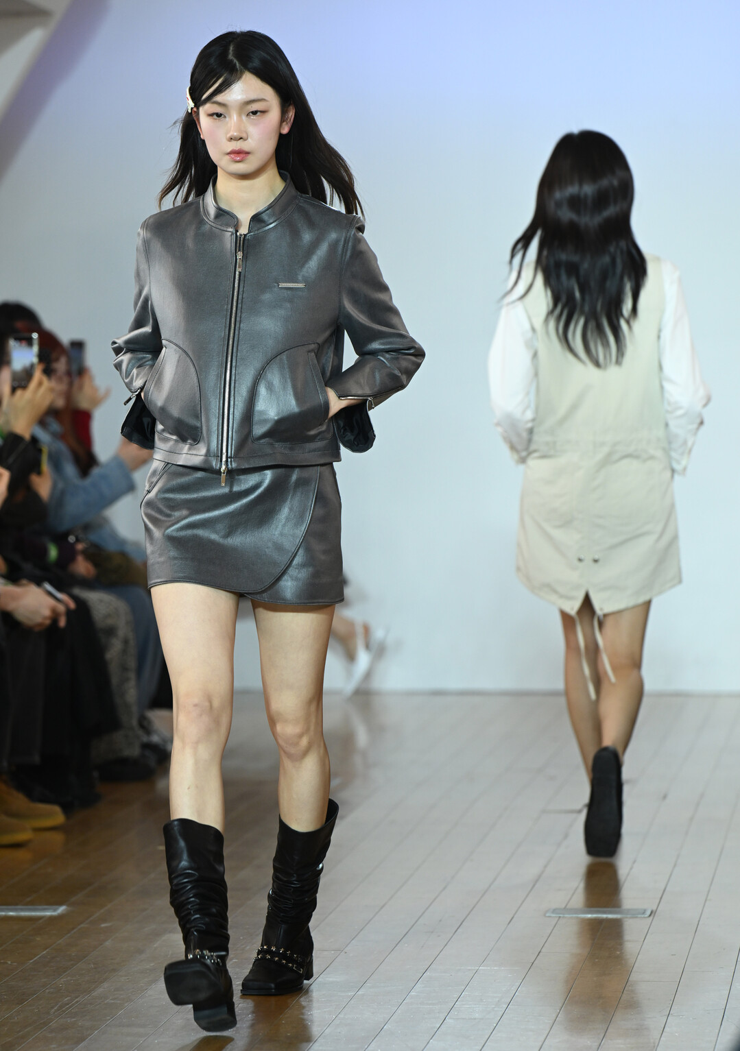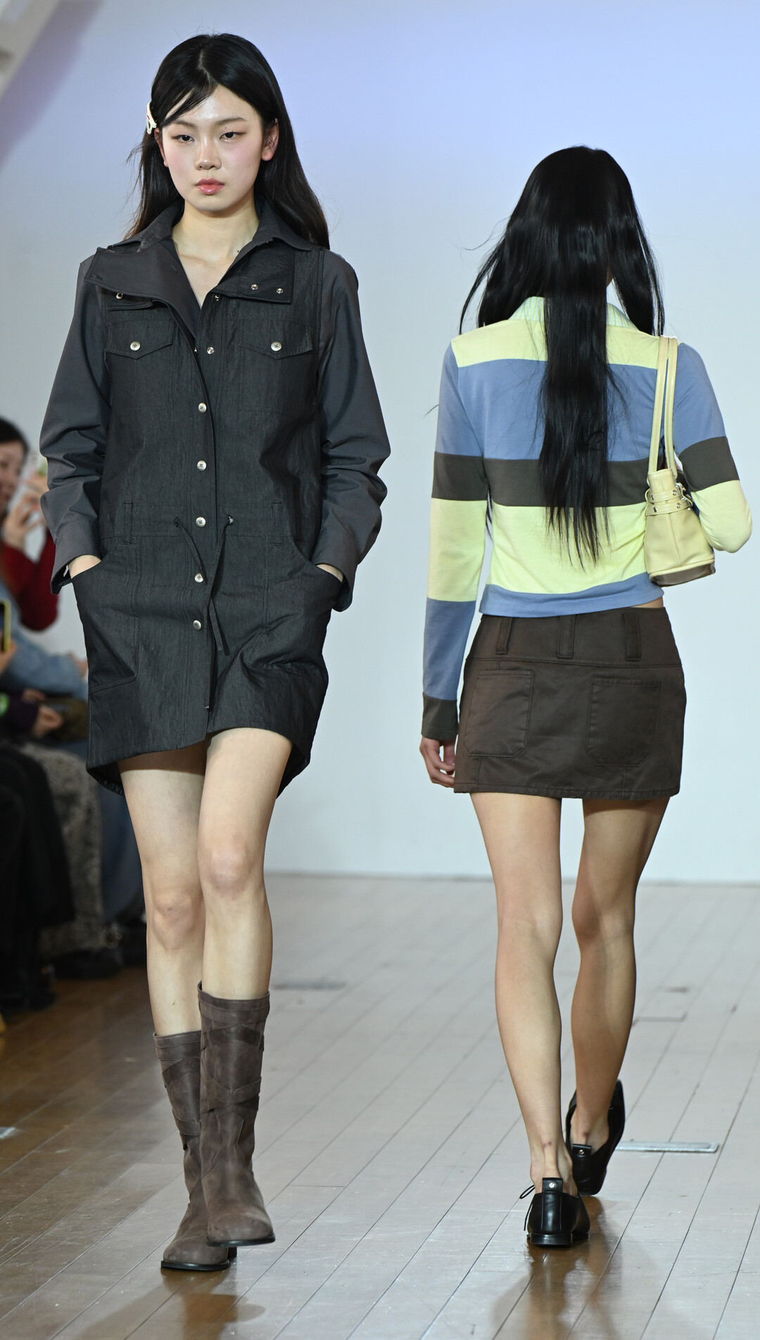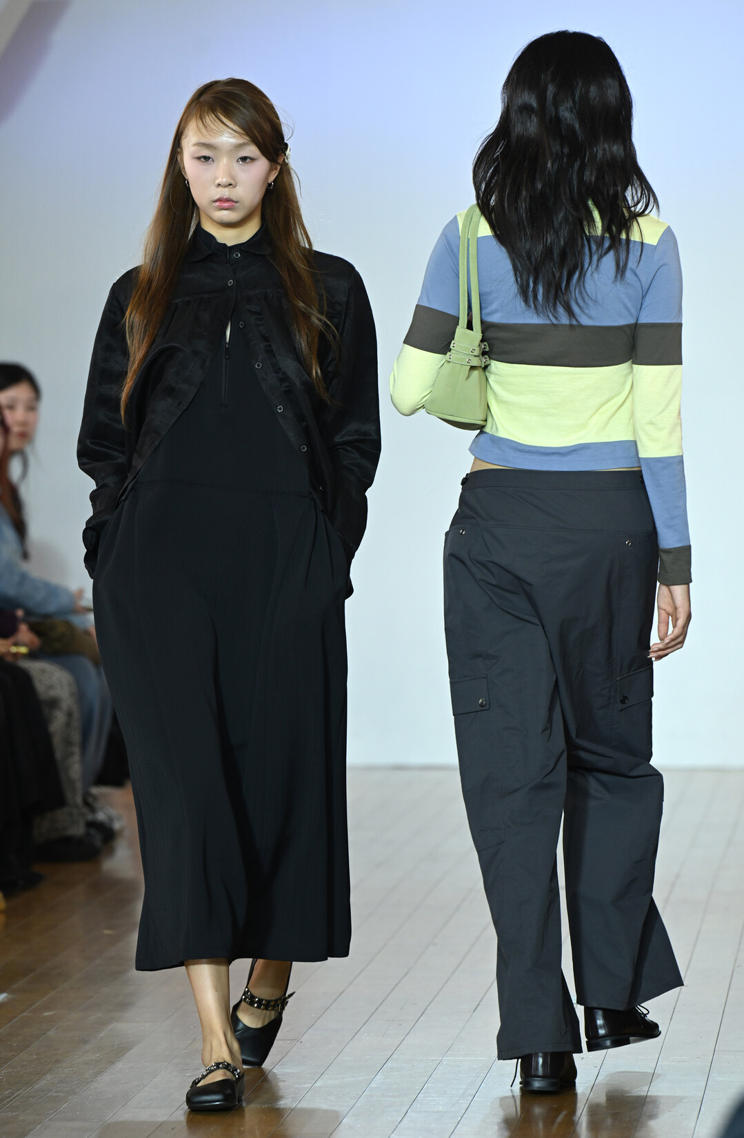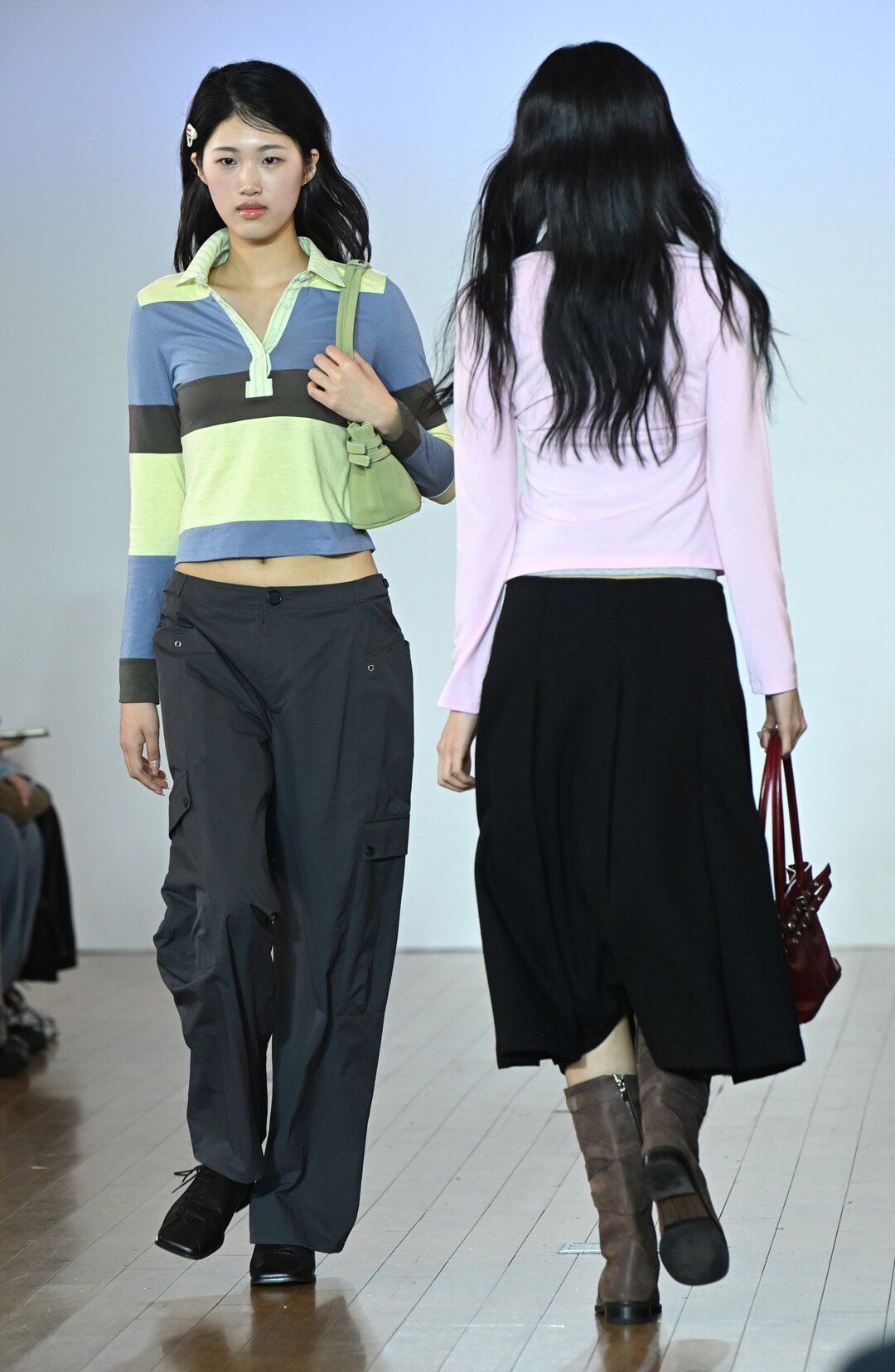 컬렉션 전반에는 2000년대 초반의 감수성이 짙게 흘렀다. 라임 옐로우·블루·다크 그레이를 가로로 분할한 스트라이프 크롭 폴로 셔츠, 카고 디테일의 루즈한 팬츠, 스터드 장식 앵클 부츠와 메리제인 슈즈—당시를 살았던 세대에게는 향수로, Z세대에게는 새로운 레퍼런스로 읽힐 코드들이 런웨이를 채웠다. 그러나 단순한 복각이 아니었다. 블랙 맥시 원피스 위에 코듀로이 질감의 셔츠 재킷을 걸친 레이어링, 그레이 레더 집업 재킷과 미니스커트의 매칭은 과거의 언어를 현재의 문법으로 재조합한 결과물이었다.