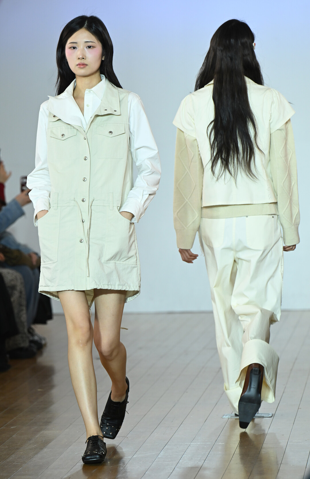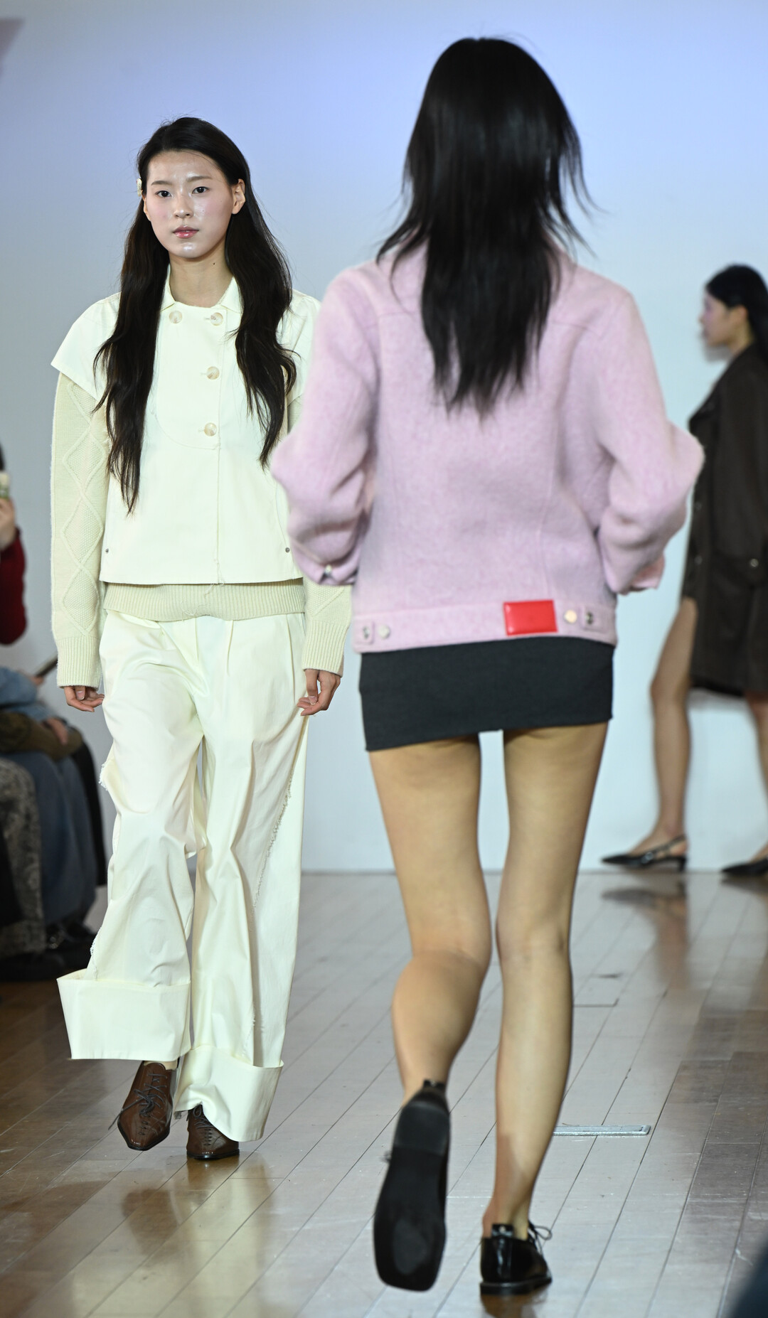 색채 운용도 인상적이었다. 크림·아이보리·오프화이트로 구성된 토널 룩이 한 축을 이루는 가운데, 라임·블루·그레이의 팝한 스트라이프와 버건디 핸드백, 카키 그린 숄더백이 포인트로 개입했다. 이 대비는 단순한 스타일링 선택을 넘어 브랜드가 다루는 감정의 스펙트럼—조용함과 소란함, 절제와 분출—을 시각화한 것처럼 읽혔다. 다크 슬레이트 그레이 밀리터리 필드 재킷 원피스와 카고 팬츠 조합에서는 거칠고 실용적인 감각이, 핑크 퍼피 니트 재킷과 블랙 미니스커트 조합에서는 소녀적 낭만이 교차했다.