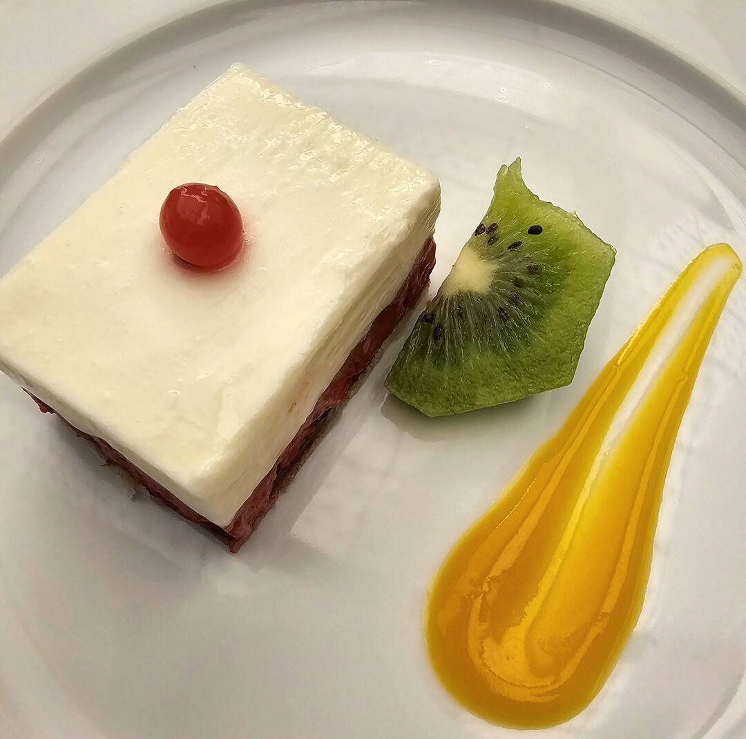 화이트 플레이트 위에 우아하게 담긴 이 디저트는 크림치즈 무스층과 라즈베리 컴포트층이 겹겹이 쌓인 레드벨벳 케이크를 중심으로, 신선한 키위와 골드키위, 그리고 상큼한 체리가 조화롭게 배치됐다.