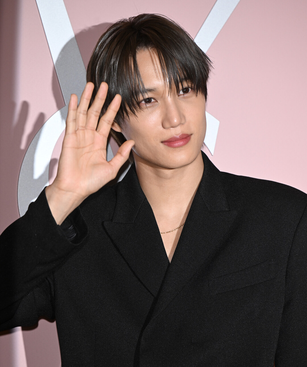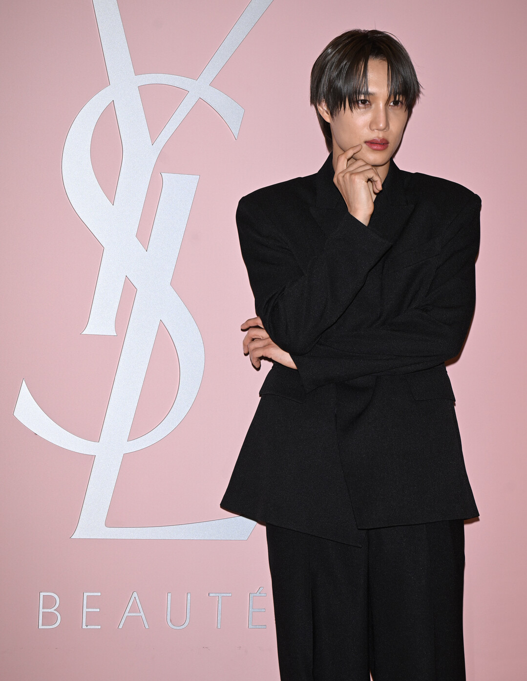 이날 스타일링에서 가장 탁월한 지점은 행사 배경과의 색 대비다. 입생로랑 뷰티 특유의 파우더 핑크 무드로 꾸며진 팝업 공간과 YSL 로고 배경 앞에서, 카이의 올블랙 수트는 마치 의도적으로 설계된 것처럼 완벽한 시각적 충돌을 만들어냈다. 파스텔 핑크의 부드럽고 로맨틱한 무드와 칠흑 블랙의 강렬하고 냉철한 카리스마가 충돌하며, 카이가 서 있는 모든 프레임이 하나의 완성된 패션 화보처럼 완성됐다. 이는 단순한 우연이 아닌, 브랜드와 앰버서더 간의 깊은 이해와 신뢰가 만들어낸 스타일링의 결과다.