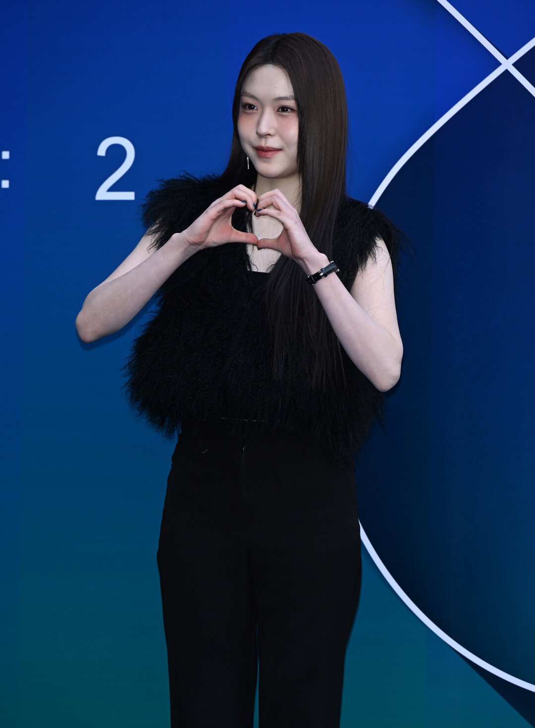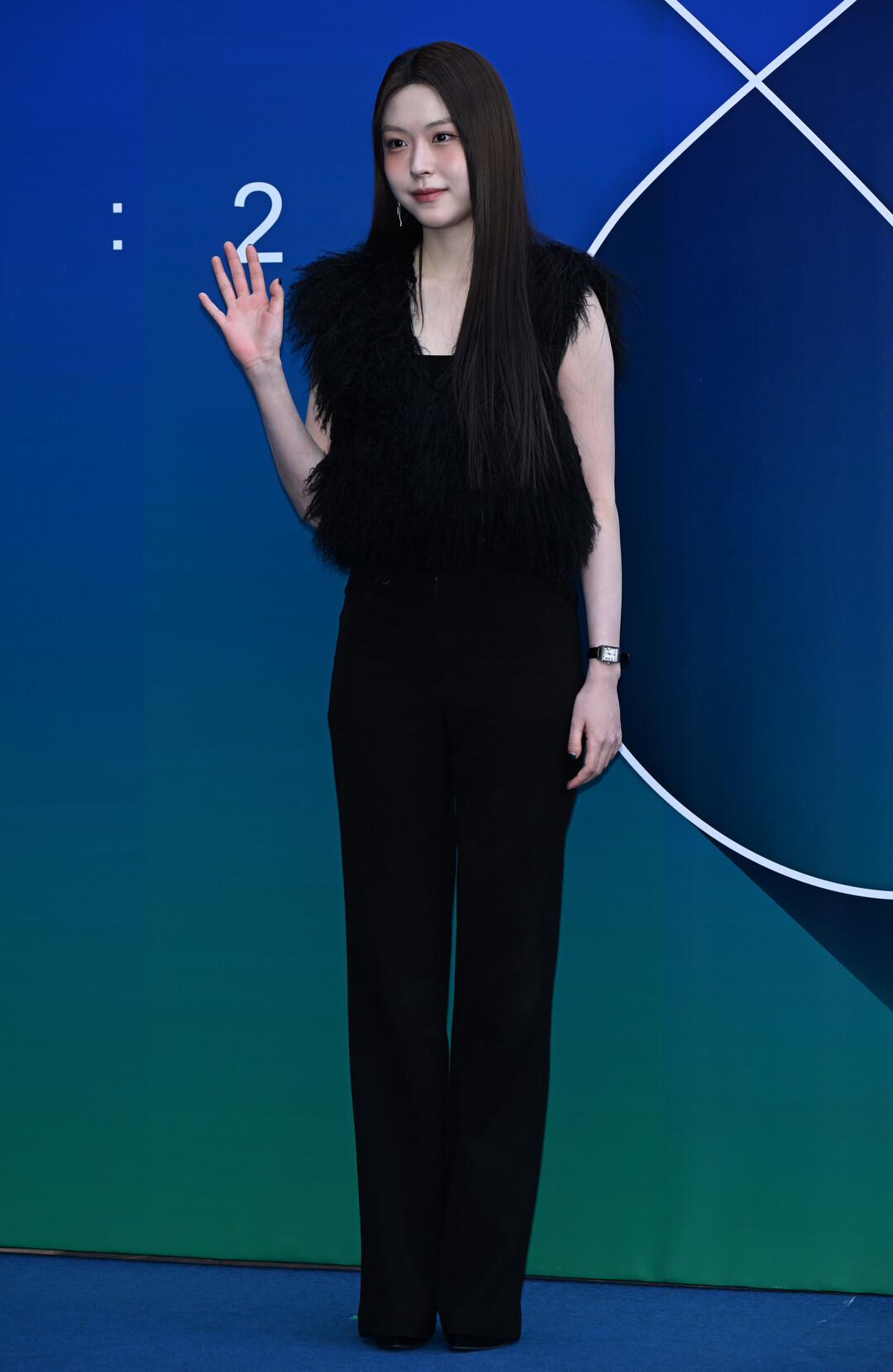 이날 황지아는 블랙 퍼 베스트에 블랙 팬츠를 매치한 올블랙 룩으로 등장했다. 슬리브리스 디자인의 퍼 베스트는 풍성한 볼륨감과 텍스처로 고급스러움을 더했으며, 깔끔한 실루엣의 팬츠와 조화를 이루며 모던하면서도 시크한 분위기를 연출했다.