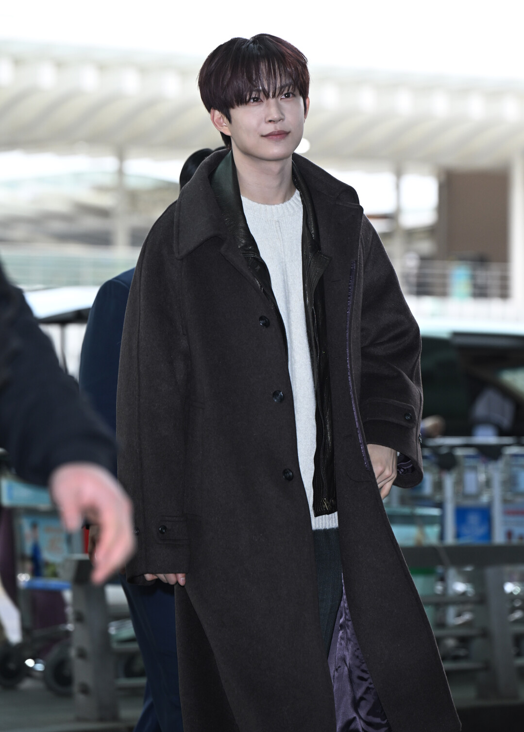 다크 브라운 롱코트로 완성한 겨울 공항 패션
