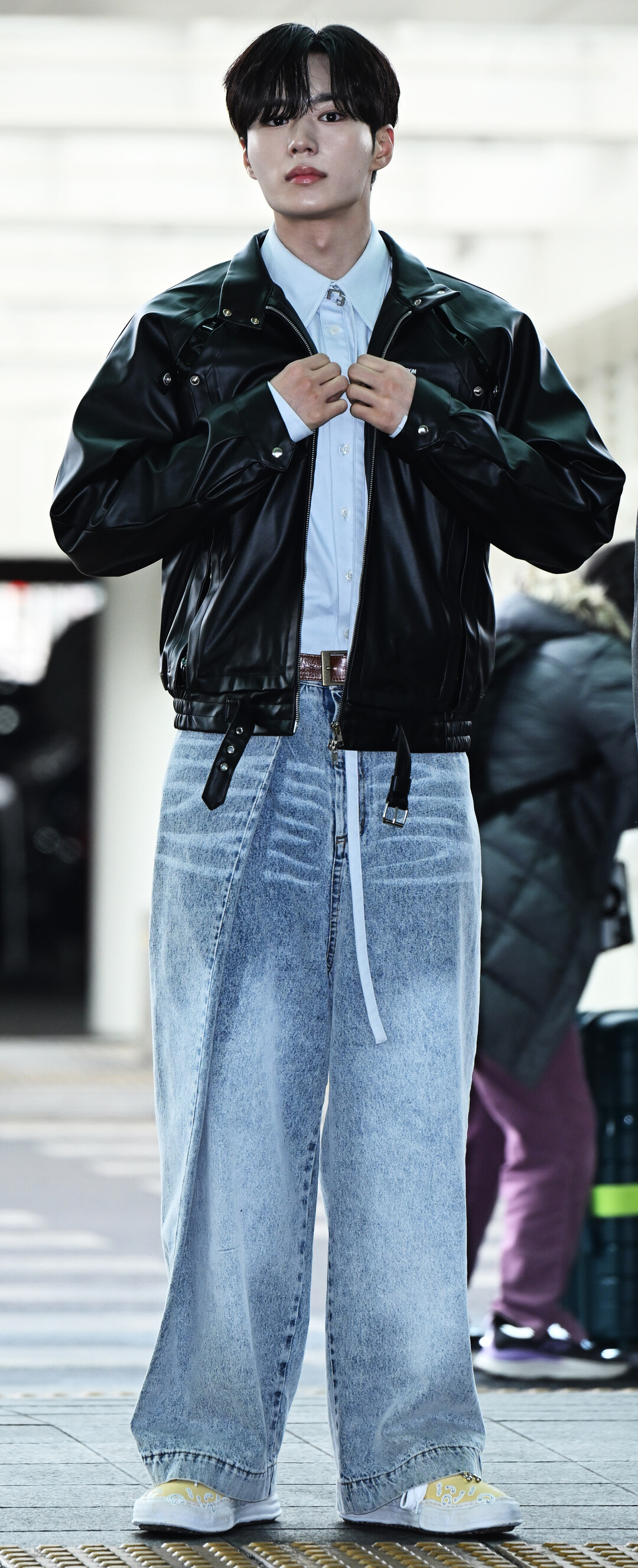 이날 준서의 공항 패션은 강렬한 대비와 정교한 레이어링이 돋보이는 스트리트 시크 룩으로 완성됐다. 글로시한 광택이 살아있는 블랙 레더 소재의 봄버 재킷을 메인 피스로 선택, 재킷 곳곳에 배치된 실버 스터드 장식과 스트랩 디테일이 에지 있는 분위기를 강조했다. 재킷 가슴 왼편에는 'BONBOM' 레이블이 선명하게 새겨져 있어 브랜드 아이덴티티를 드러냈다.