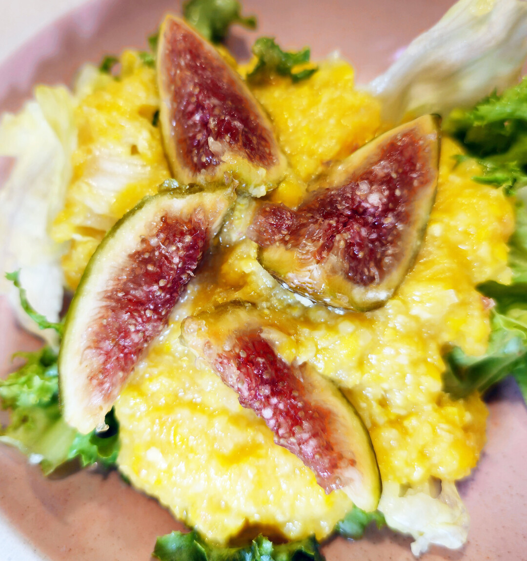 무화과절임은 무화과를 4등분한 후, 식초와 설탕 등을 섞어 만든 절임이다. 무화과를 바치고 있는 것은 레몬을 중심으로 만든 샐러드다. 무화과절임은 무화과 특유의 맛과 레몬의 새콤함이 섞여 있어 풍미가 남다르다.