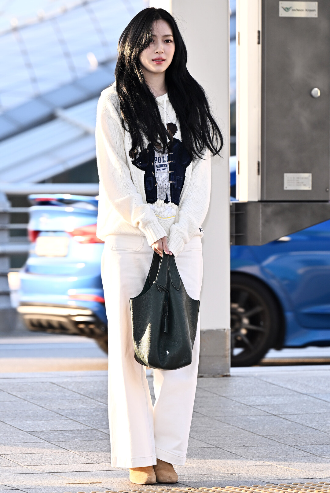 싱가포르 일정을 위해 출국한 류진은 크림 아이보리 니트 스웨터를 중심으로 한 올화이트 룩을 선택했다. 상의에는 블랙 그래픽 프린트가 포인트로 가미돼 단조로움을 피하면서도 세련된 대비 효과를 냈다.