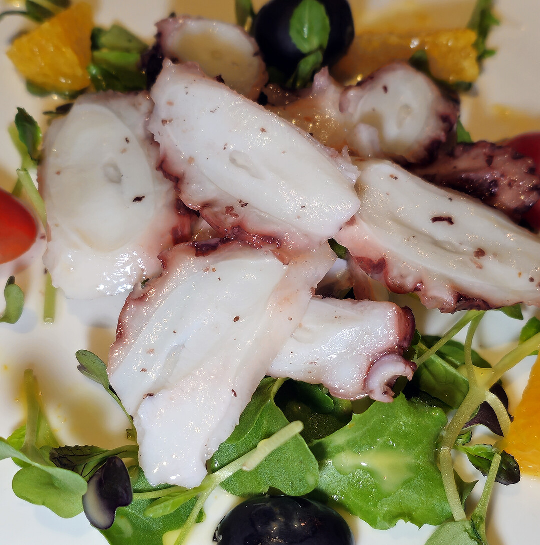 이 요리는 삶은 문어를 얇게 슬라이스해 루꼴라, 적양배추 등 신선한 채소 위에 올리고 레몬과 올리브오일 드레싱으로 마무리한다. 문어 특유의 쫄깃하면서도 부드러운 식감이 아삭한 채소, 블랙 올리브의 풍미, 레몬의 상큼함과 어우러져 입안에서 산뜻한 조화를 이룬다.