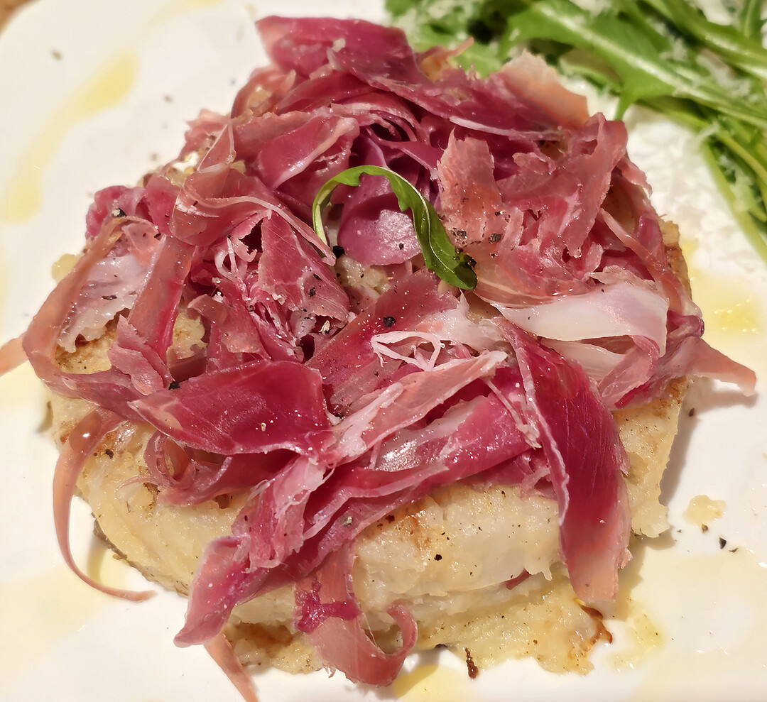 이 요리는 삶아서 으깬 감자를 팬에 노릇하게 구운 뒤 이탈리아산 프로슈토를 장미꽃처럼 아름답게 얹어 완성한다. 고소하고 부드러운 감자의 크리미한 질감에 프로슈토 특유의 짭조름하면서도 고소한 풍미가 더해져 입안에서 깊은 감칠맛을 선사한다.