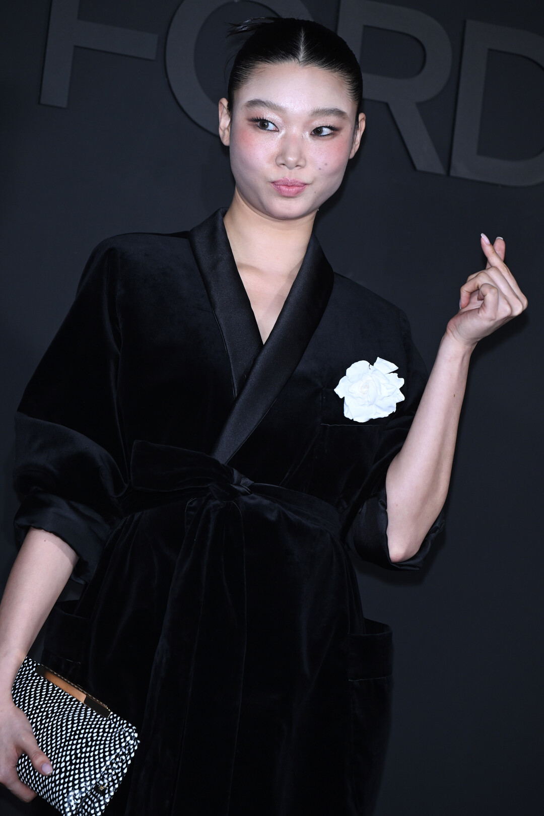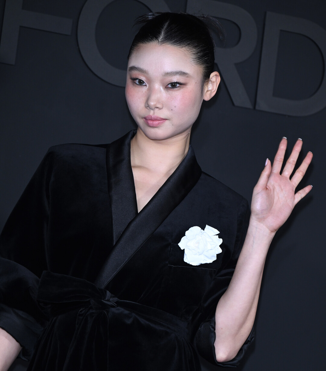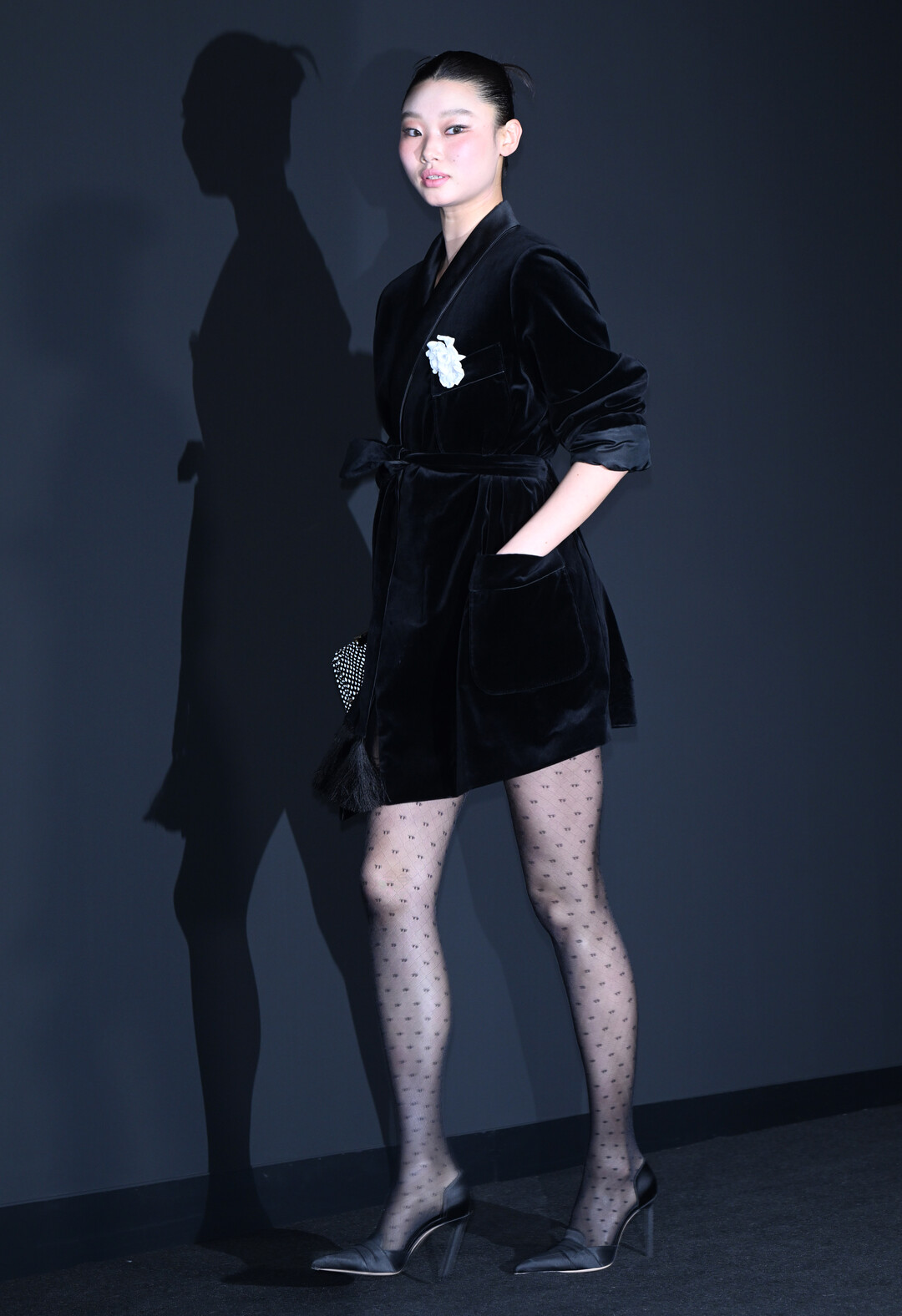 이날 배윤영은 깊고 풍성한 광택의 블랙 벨벳 소재 로브형 재킷을 선택해 행사장 분위기와 완벽한 조화를 이뤘다. 새틴 라펠 칼라와 벨트 타이 디테일이 실루엣에 우아한 긴장감을 부여했으며, 재킷 밑단을 장식한 블랙 프린지가 볼륨감 있는 룩에 율동적인 포인트를 더했다. 가슴 포켓에 달린 화이트 카멜리아 코사지는 짙은 블랙의 단색 코디 위에서 시선을 단번에 집중시키는 결정적 액센트로 기능하며, 강렬함 속에 낭만적인 감성을 녹여냈다.