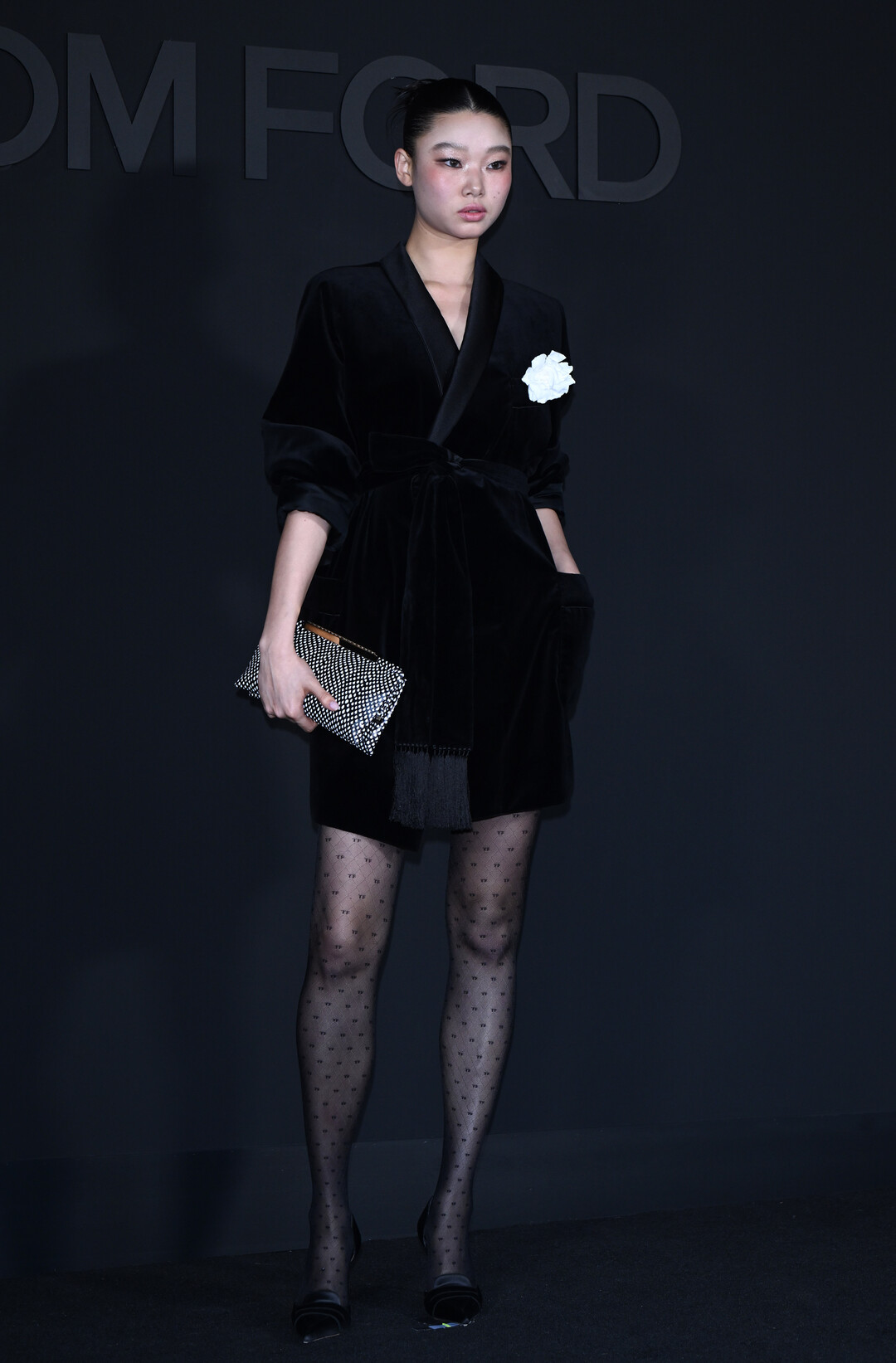 하의로는 'TF' 이니셜 모노그램 패턴이 반복된 시스루 레깅스를 매치해 브랜드 정체성을 룩 전체에 자연스럽게 녹여냈다. 섬세한 격자 패턴 위로 새겨진 톰 포드 로고는 가까이 들여다볼수록 완성도를 실감하게 하는 디테일이다. 여기에 블랙&화이트 크리스털 패턴의 이브닝 클러치백을 들어 모노크롬 톤에 입체적인 질감 대비를 연출했으며, 슬림한 스틸레토 힐로 전체 비례를 한층 끌어올렸다.