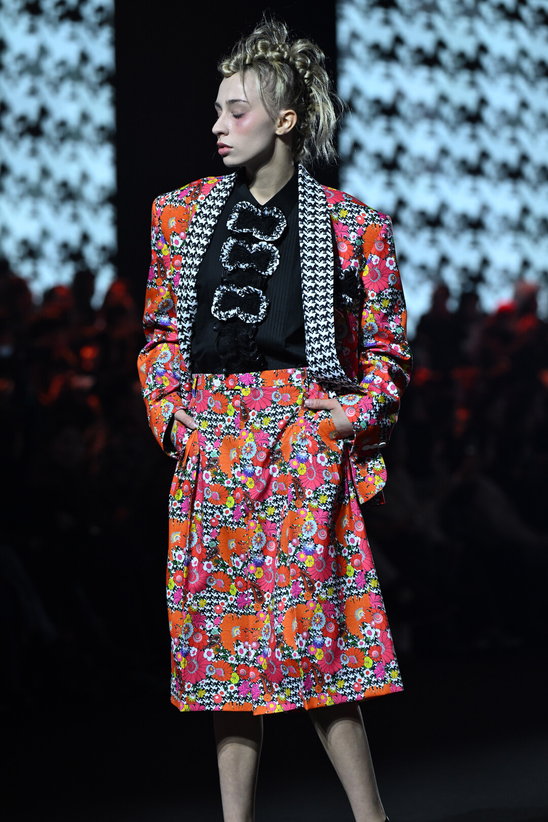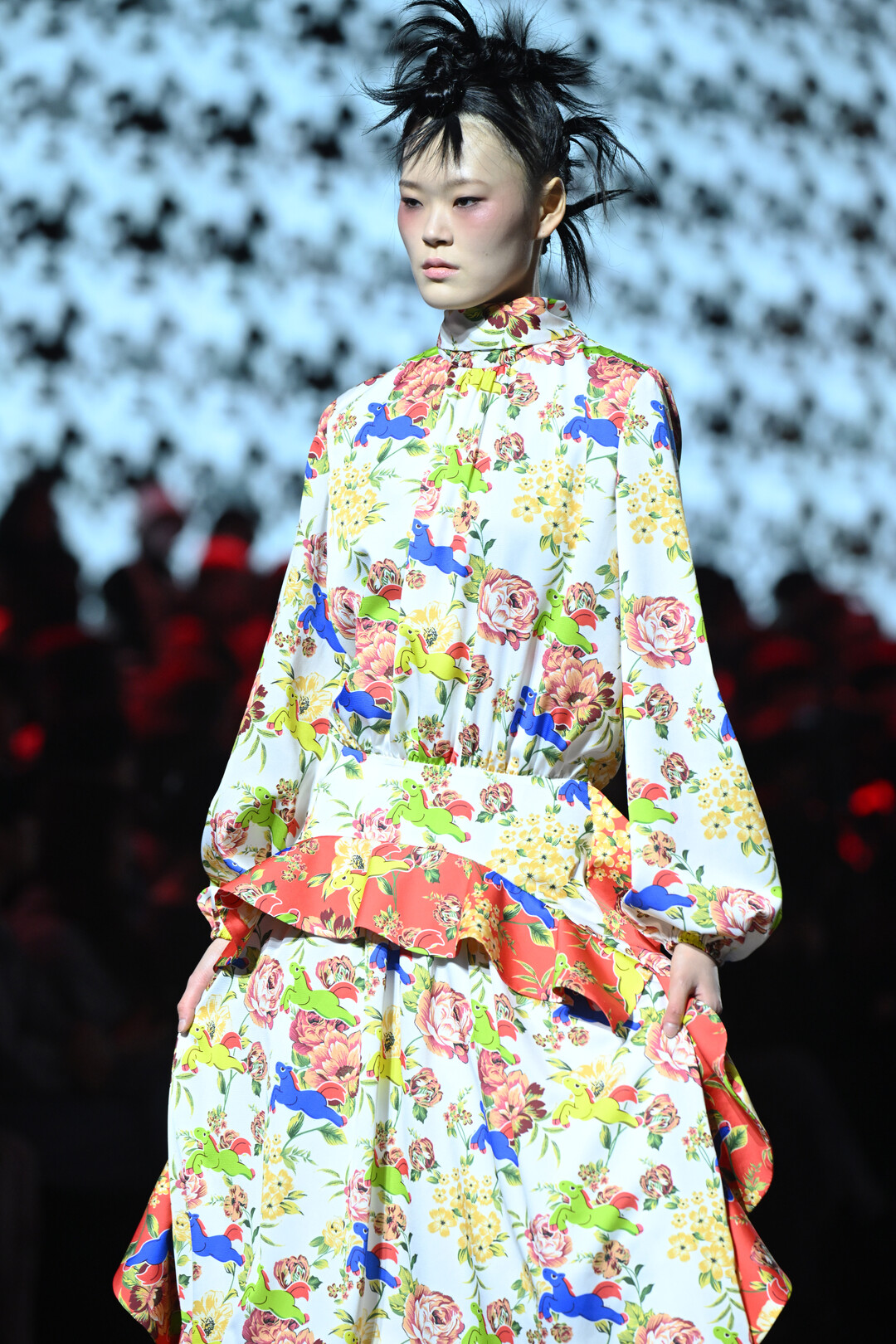 특히 눈에 띄는 것은 전통 한복의 색동 패턴과 기하학적 프린트를 결합한 텍스타일 작업이었다. 핑크, 오렌지, 블루, 옐로우 등 원색의 꽃무늬가 블랙 앤 화이트의 체크 패턴, 하운드투스와 충돌하며 시각적 긴장감을 극대화했다. 여기에 캐릭터 그래픽과 로고 타이포그래피를 더해 팝아트적 유희까지 담아냈다.