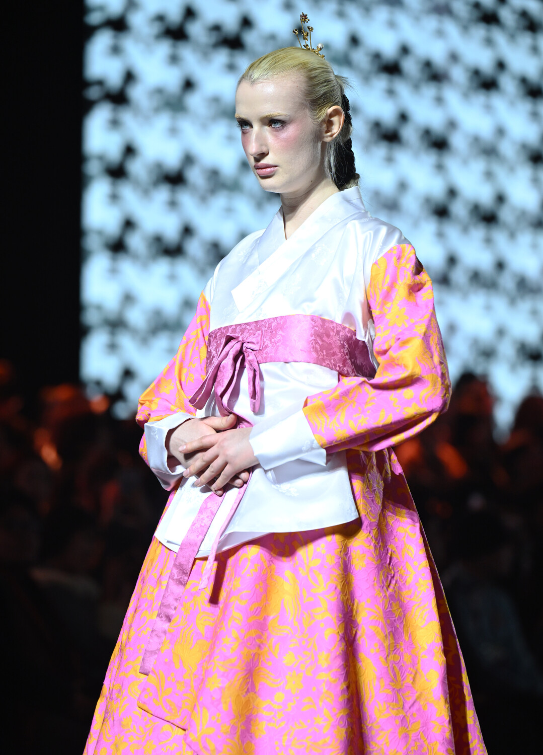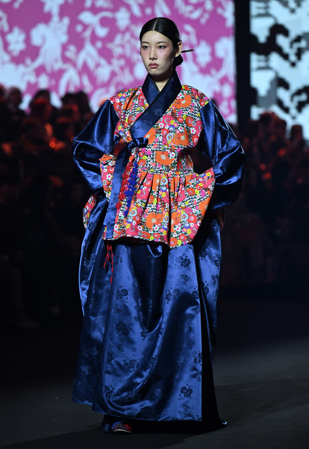 런웨이를 장식한 작품들은 전통 한복의 실루엣과 서양 테일러링 기법의 과감한 결합으로 시선을 사로잡았다. 화려한 꽃무늬 프린트의 한복 저고리 위에 천연염색 기법이 적용된 현대적 재킷을 레이어링하거나, 전통 치마의 볼륨감을 살린 플리츠 스커트와 하운드투스 패턴의 재킷을 매치하는 등 동서양의 미학적 경계를 자유롭게 넘나들었다.