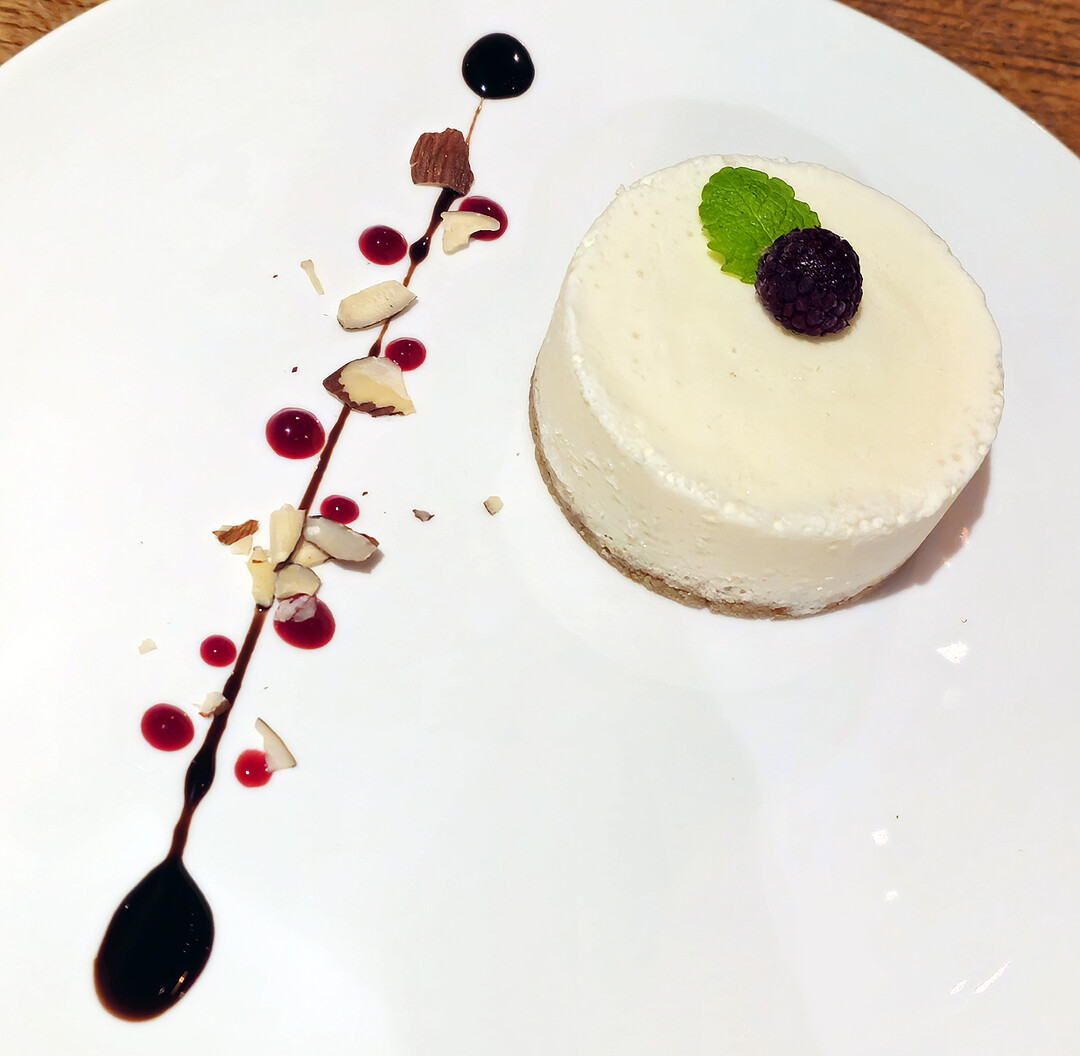 견과류는 고소하고 바삭한 식감으로 크리미한 무스와 대비를 이루며, 베리 쿨리의 새콤달콤한 맛이 치즈의 느끼함을 잡아준다. 다크 초콜릿 소스의 쌉싸름한 풍미와 슬라이스 아몬드의 고소한 크런치가 더해져 다층적인 맛의 조화를 완성한다. 블랙베리와 민트는 신선한 향과 함께 시각적 포인트를 준다.