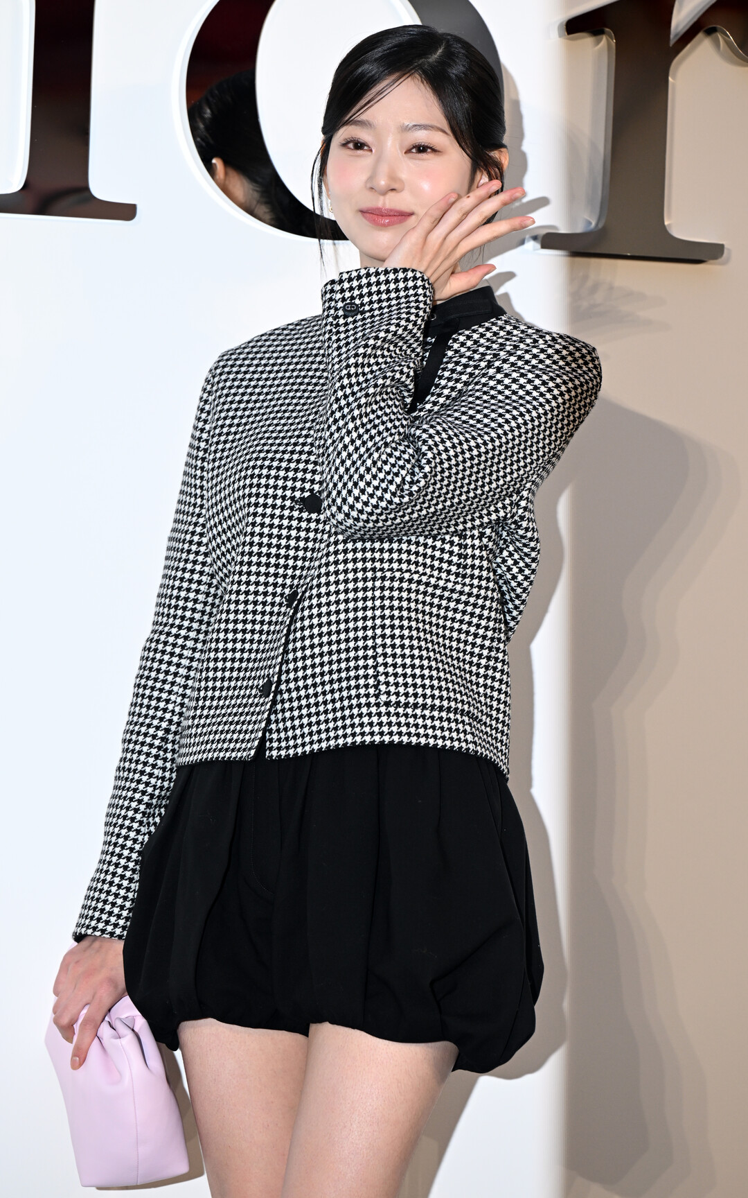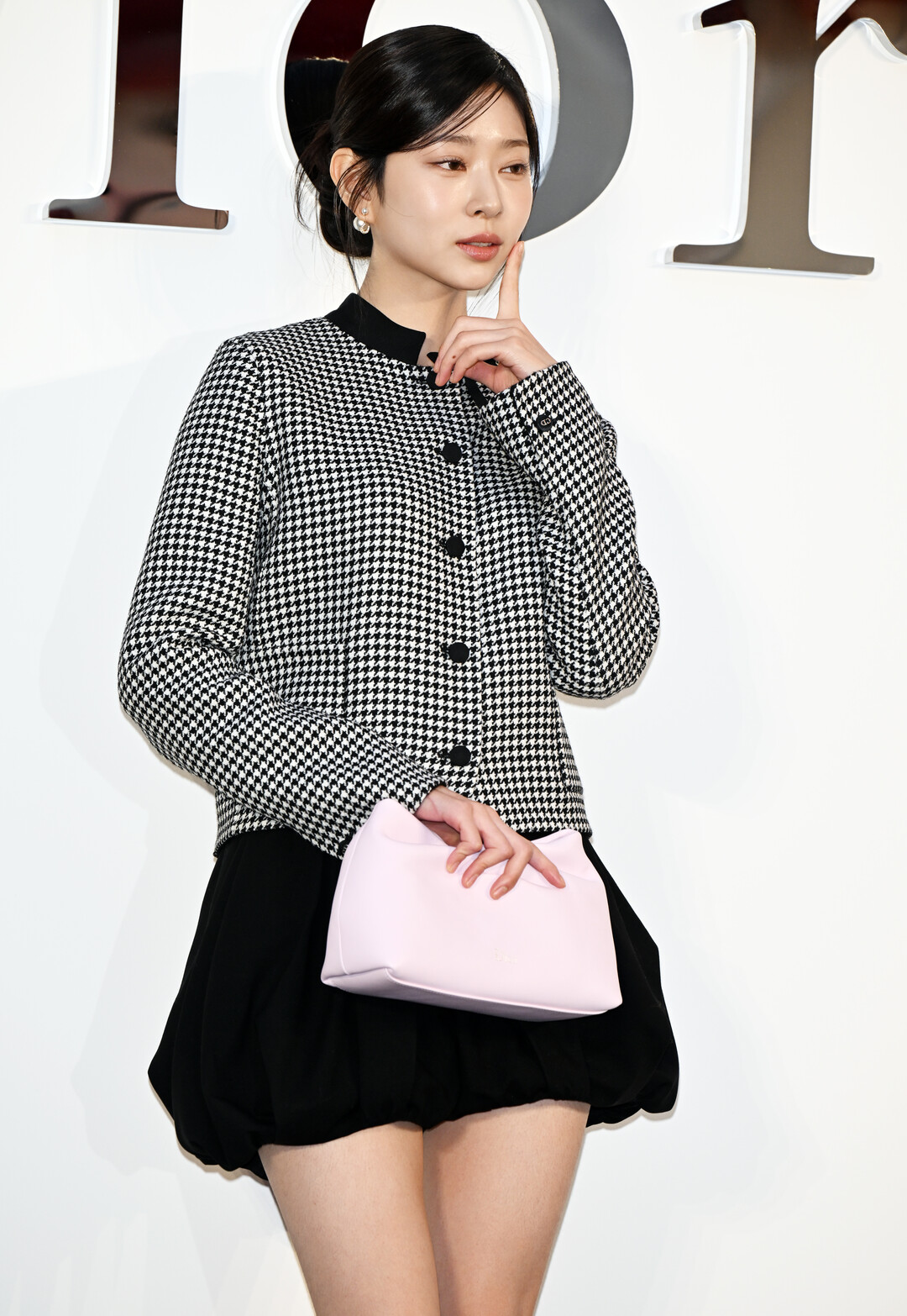 전체적으로 블랙과 화이트의 모노톤 조합을 선택한 김민주는 페일 핑크 컬러의 디올 백으로 화사한 포인트를 더했다. 부드러운 곡선의 이 백은 손에 들었을 때 세련된 실루엣을 만들며, 하운드투스 재킷의 강렬한 패턴과 절묘한 조화를 이뤘다. 깔끔하게 올린 업스타일 헤어는 목선을 드러내며 재킷의 칼라 디테일을 더욱 돋보이게 했다.