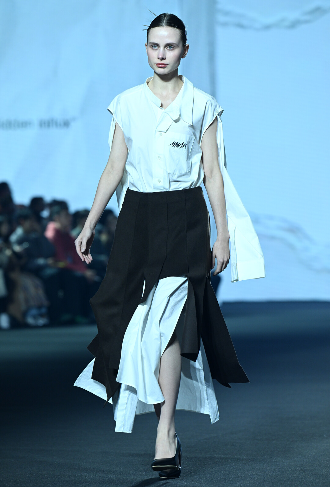 특히 데님과 트렌치코트의 조합, 크롭 톱과 하이웨이스트 팬츠로 구성된 울 수트는 일상복과 정장의 경계를 허물며 현대 여성의 다층적 정체성을 표현했다. "MMAM"이라는 로고가 새겨진 민트색 셔츠 위에 블랙 스커트를 레이어링한 룩은 스트리트와 하이패션을 자연스럽게 연결하는 디자이너의 감각을 입증했다.