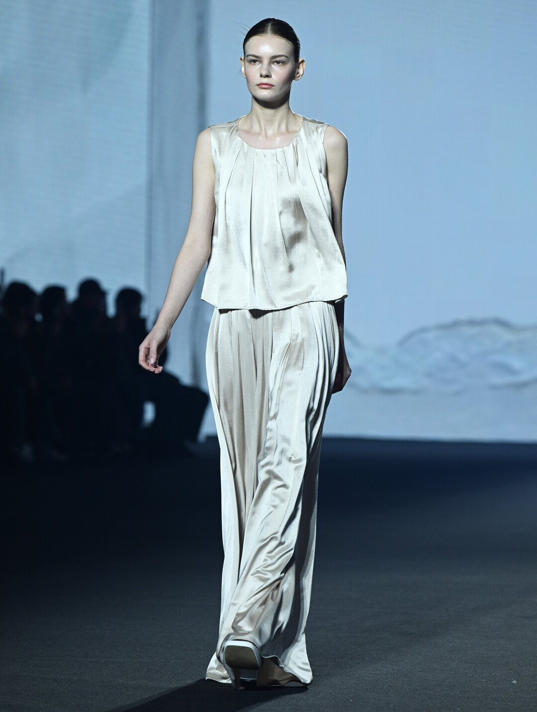 런웨이를 가득 채운 것은 아이보리, 베이지, 그레이, 블루그레이 등 절제된 뉴트럴 톤이었다. 화려함 대신 고요함을, 장식 대신 본질을 추구하는 디자이너의 철학이 고스란히 드러났다. 플리츠로 입체감을 더한 새틴 세트업, 어깨를 탈의한 듯한 트렌치코트, 벨트로 허리선을 강조한 오버사이즈 재킷 등은 클래식한 실루엣 안에서도 해체와 재구성의 실험을 보여줬다.