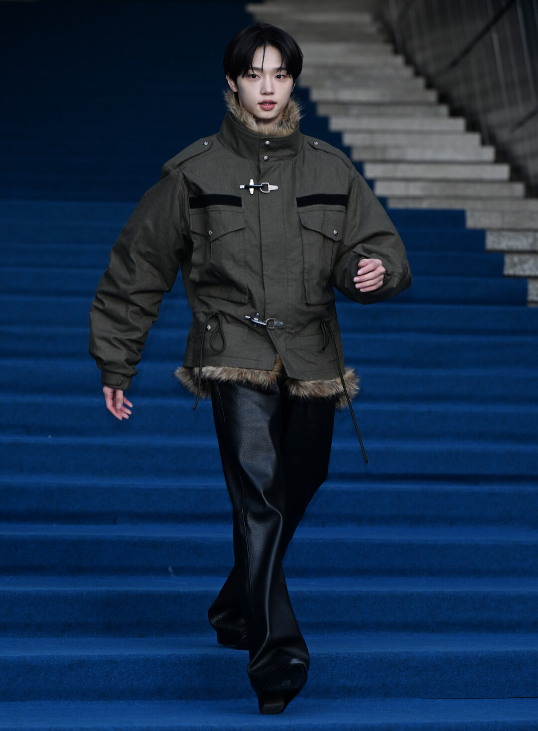 손동표가 선택한 아웃핏은 견장 디테일과 플랩 포켓이 돋보이는 카키 컬러 재킷으로, 목선과 밑단에 배치된 퍼 트리밍이 실용성과 고급스러움을 동시에 구현했다. 가슴과 허리의 토글 버튼 클로저는 기능적 요소이면서도 빈티지한 분위기를 더했다. 블랙 레더 팬츠와의 매칭은 전체적인 룩에 모던한 엣지를 부여하며 밀리터리 캐주얼과 어반 시크의 균형감을 보여줬다.