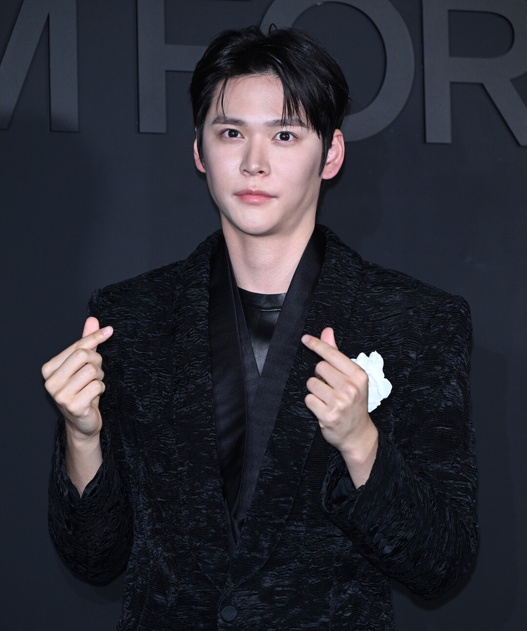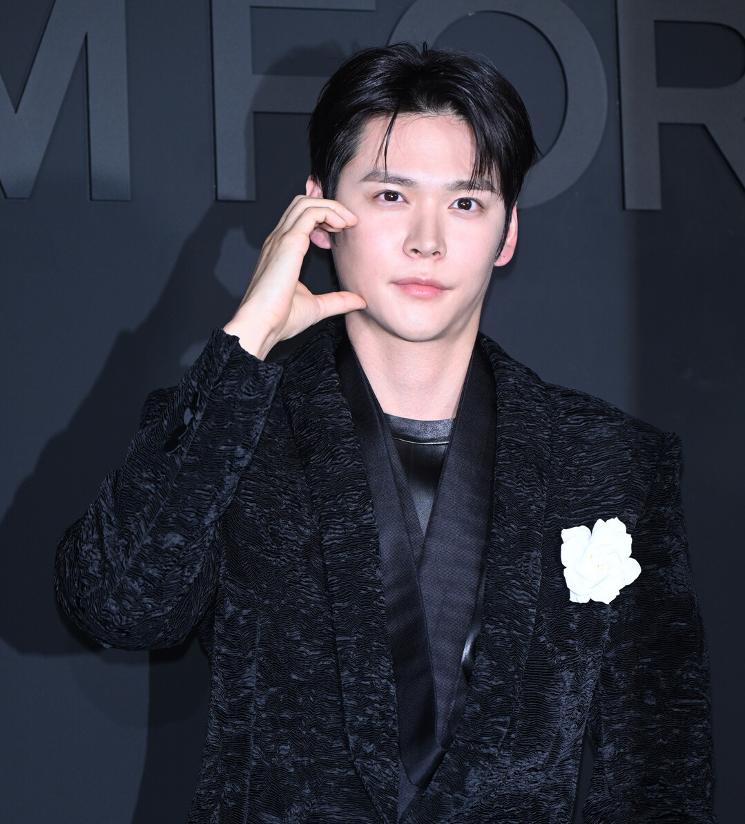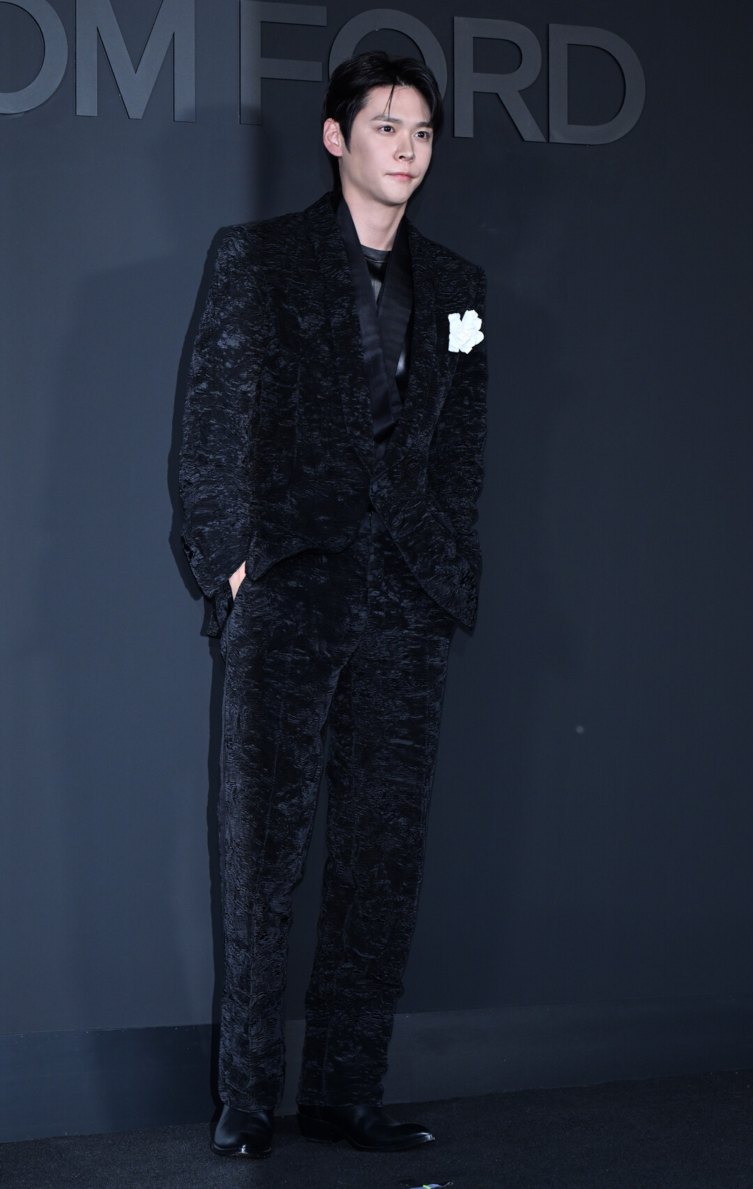 이날 은석은 불규칙한 주름 텍스처가 살아있는 블랙 크링클 벨벳 수트를 선택해 행사장 분위기와 완벽한 일체감을 이뤘다. 표면 전체에 새겨진 물결 무늬 같은 엠보 패턴이 조명 아래에서 입체적인 광택을 발하며 단순한 블랙 수트와는 차원이 다른 존재감을 연출했다. 이너로는 블랙 레더 소재의 티셔츠를 매치해 수트의 럭셔리함에 날카로운 엣지를 더했으며, 가슴 포켓의 화이트 카멜리아 코사지가 묵직한 블랙 톤 위에서 극적인 대비를 만들어냈다.