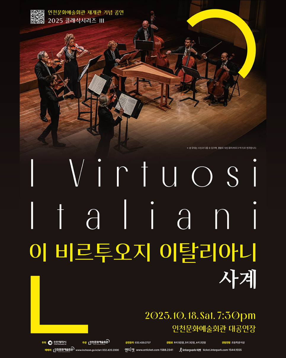 [K라이프저니 | 이여름 기자] 인천광역시 문화예술회관이 전관 재개관을 기념해 세계적인 이탈리아 챔버 오케스트라 '이 비르투오지 이탈리아니(I Virtuosi Italiani)'를 초청한다. 오는 10월 18일 인천문화예술회관 대공연장에서 펼쳐지는 이번 공연은 2025 클래식 시리즈의 세 번째 무대로, 이탈리아 바로크 음악의 정수를 선보일 예정이다.