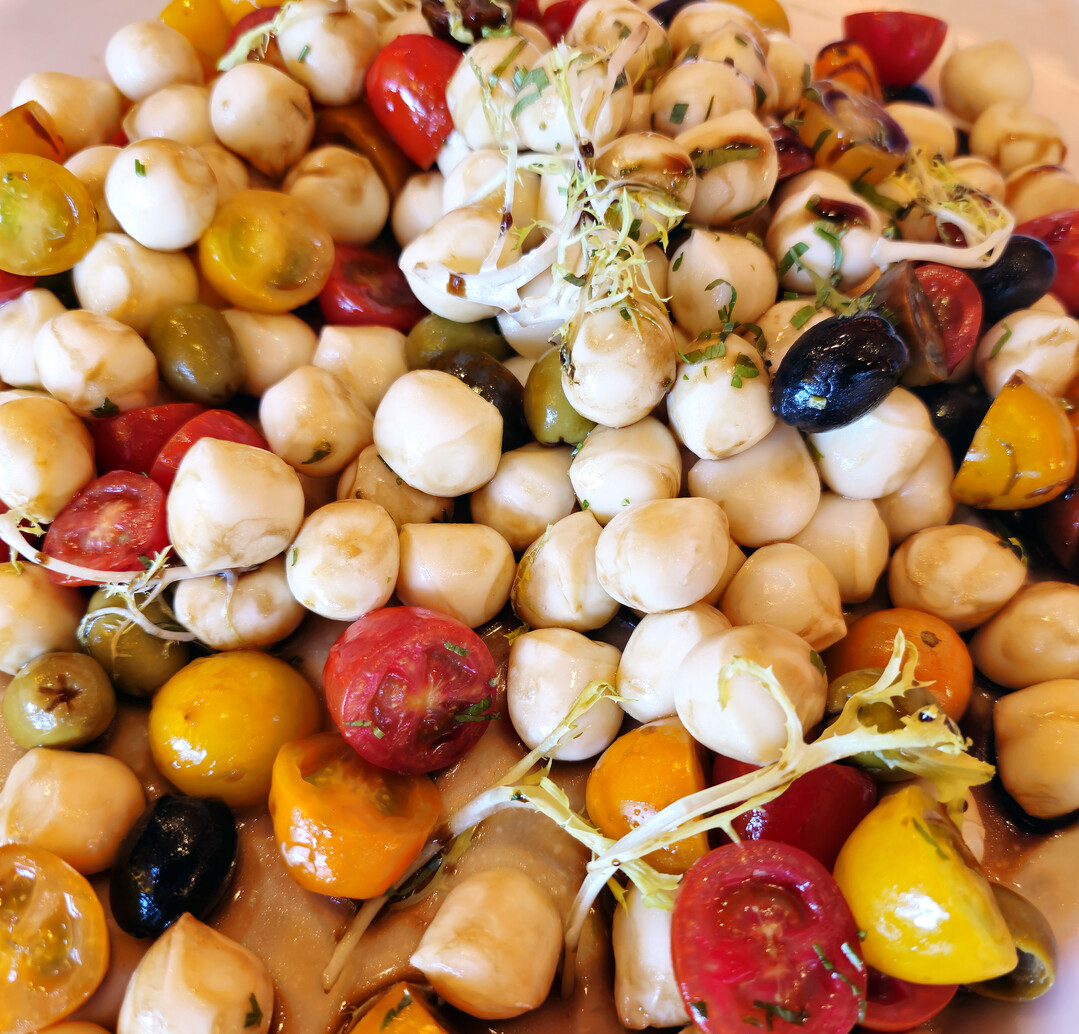 검은색과 녹색 올리브는 지중해 식단의 핵심 재료다. 올리브 특유의 짭조름하고 감칠맛 나는 풍미가 보코치니의 담백함과 토마토의 새콤달콤함 사이에서 맛의 균형을 잡아준다.