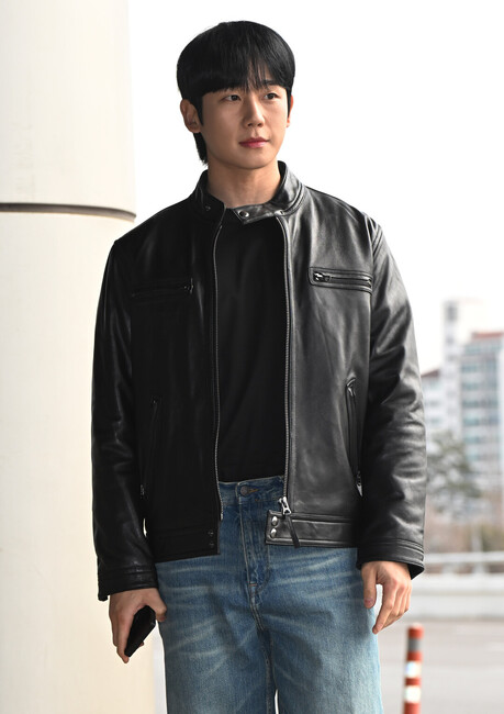 재킷은 밴드 칼라와 멀티 지퍼 디테일이 특징인 클래식한 레이서 스타일로, 군더더기 없이 정돈된 실루엣이 정해인의 단단한 체형과 맞물려 더욱 돋보였다. 부자재와 지퍼 풀러 하나하나에서 느껴지는 품질감은 전체 스타일링의 완성도를 끌어올리는 요소였다.