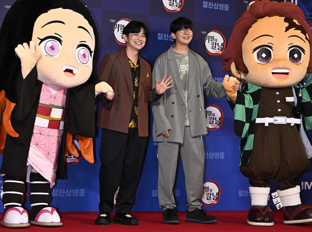 [K라이프저니|이여름 기자] 지난달 30일 오후 서울 용산 CGV에서 열린 극장판 애니메이션 '귀멸의 칼날: 무한성편' VIP 시사회 레드카펫에 일본 성우 시모노 히로(젠이츠 역)와 하나에 나츠키(탄지로 역)가 나란히 참석했다. 두 성우는 네즈코와 탄지로 캐릭터 마스코트 사이에 서서 환한 미소와 웨이브로 현장을 찾은 팬들에게 화답하며 행사 분위기를 한껏 고조시켰다.
