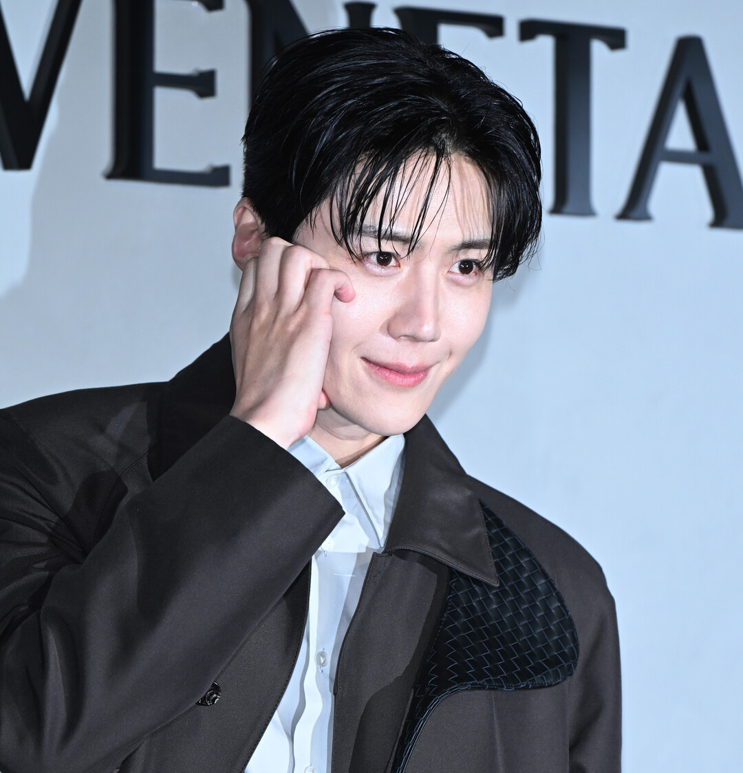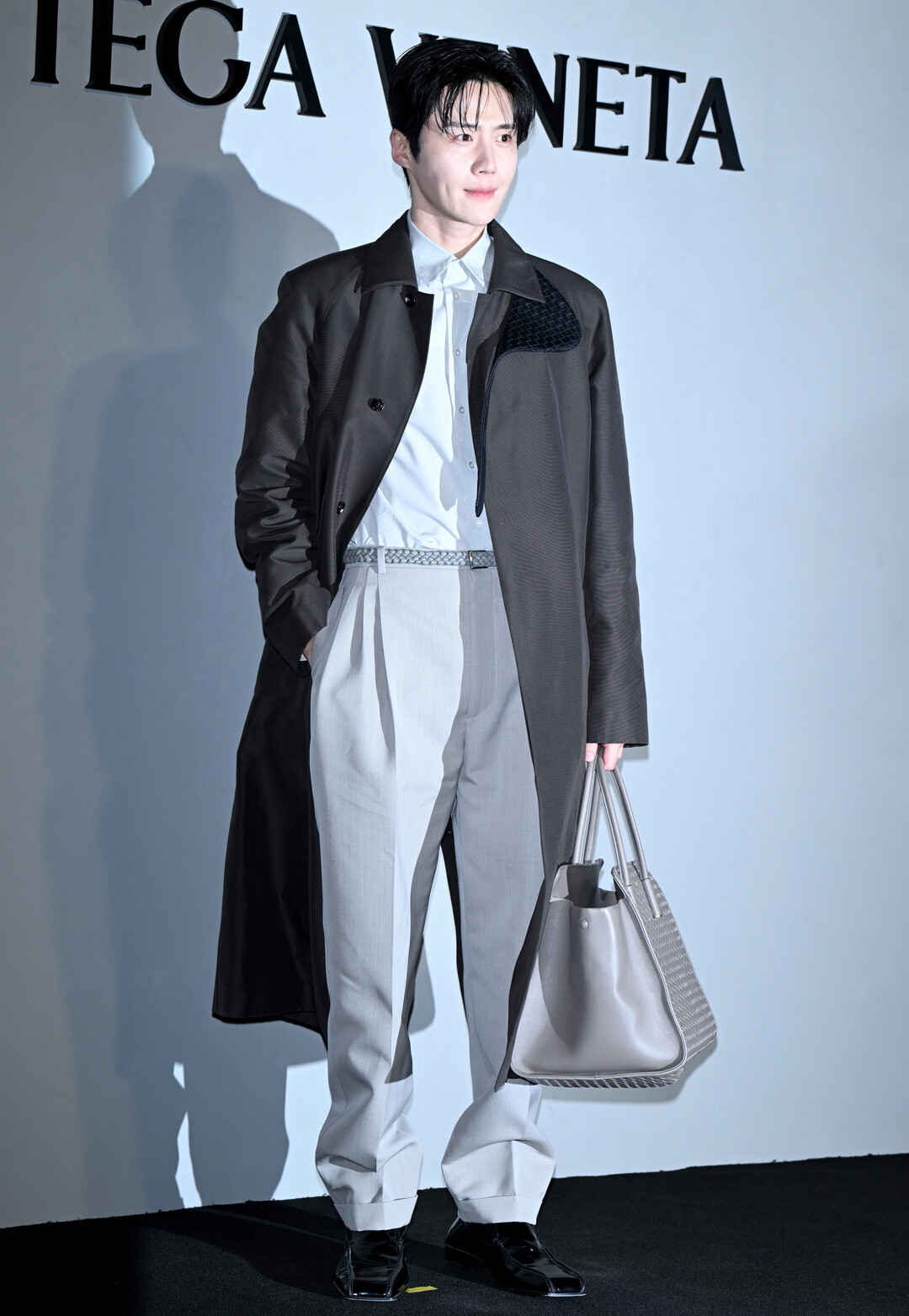 이날 김선호는 블랙 롱 코트에 화이트 셔츠, 라이트 그레이 와이드 팬츠를 매치한 모던한 스타일링을 선보였다. 특히 코트 가슴 부분에 적용된 보테가 베네타 시그니처 인트레치아토 패턴 디테일이 시선을 사로잡았다. 가죽 소재의 위빙 장식은 단조로울 수 있는 블랙 코트에 입체감과 고급스러움을 더했다.