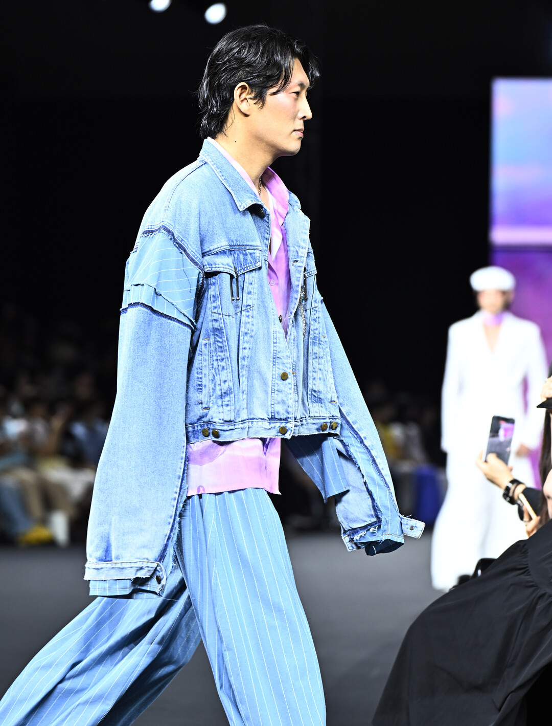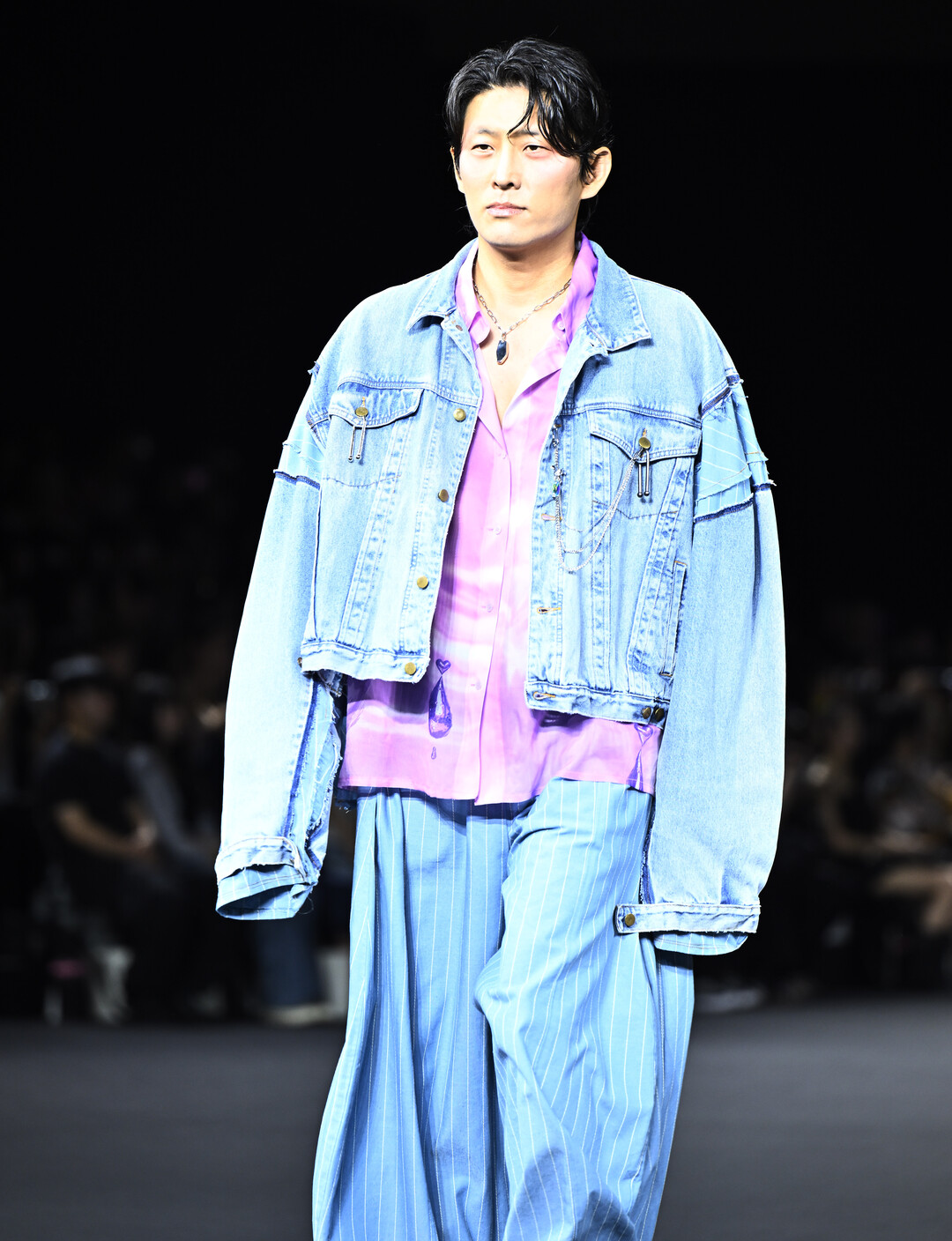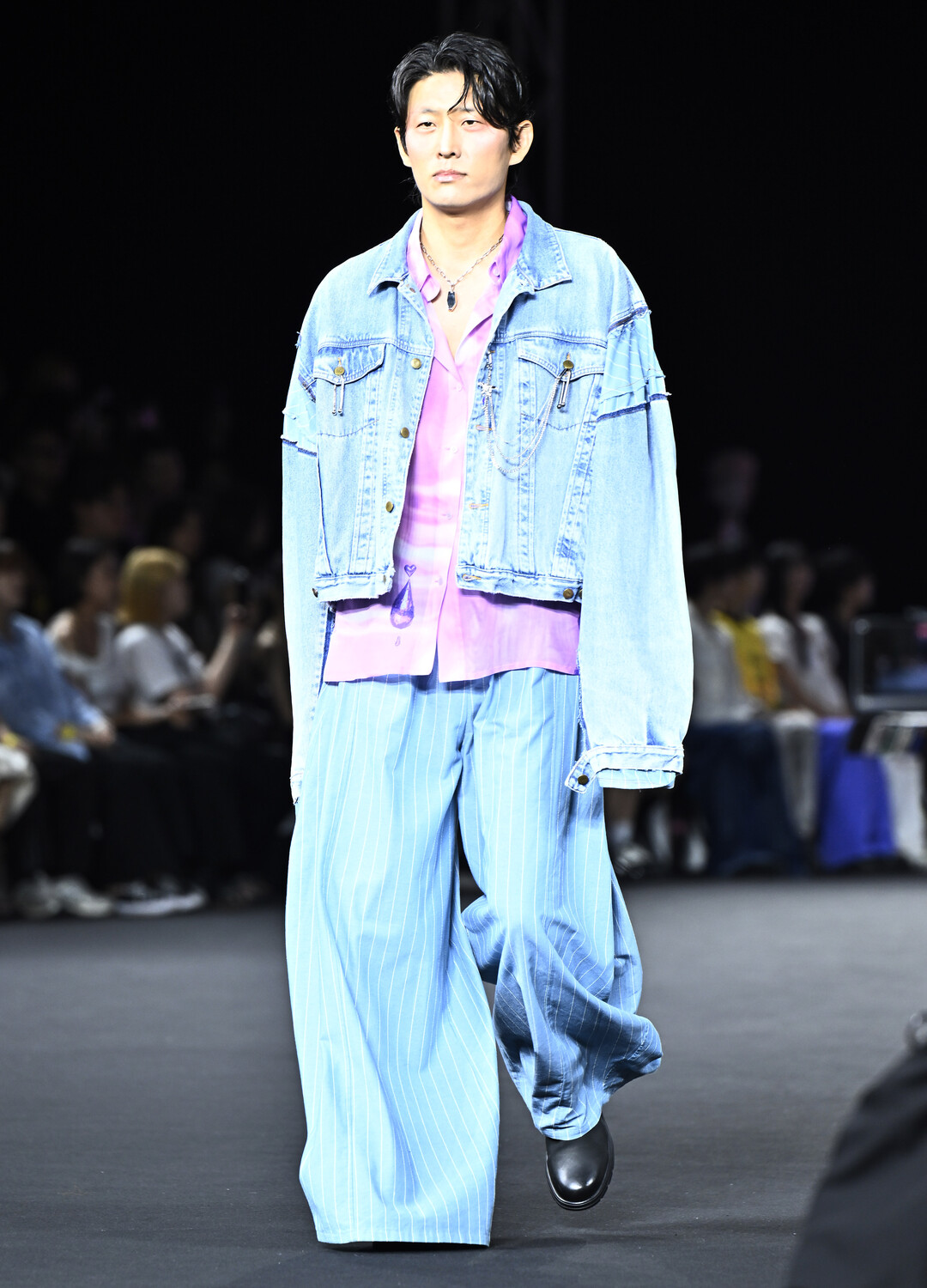 이날 고준이 선보인 룩은 라이트 블루 워싱 오버사이즈 데님 트러커 재킷에 동일 계열의 블루 핀스트라이프 울트라 와이드 팬츠를 매치한 블루 톤 온 톤 앙상블이다. 데님 재킷은 소매 부분에 의도적인 컷오프와 디스트레스드 디테일을 더해 빈티지한 질감을 살렸으며, 크롭트 기장으로 마무리해 시즌 트렌드인 숏 재킷 실루엣을 충실히 반영했다.