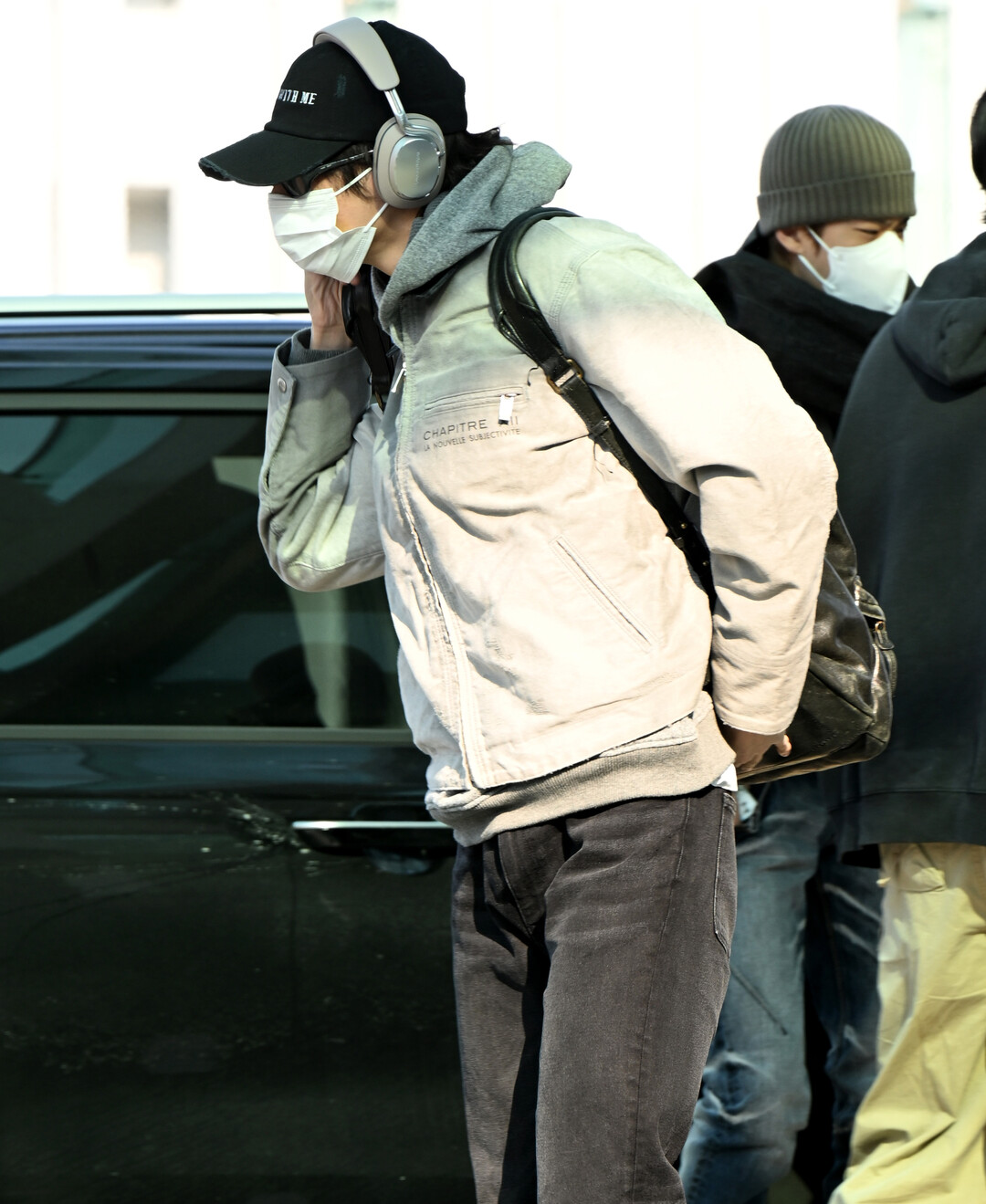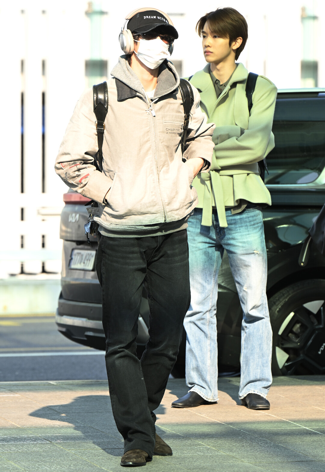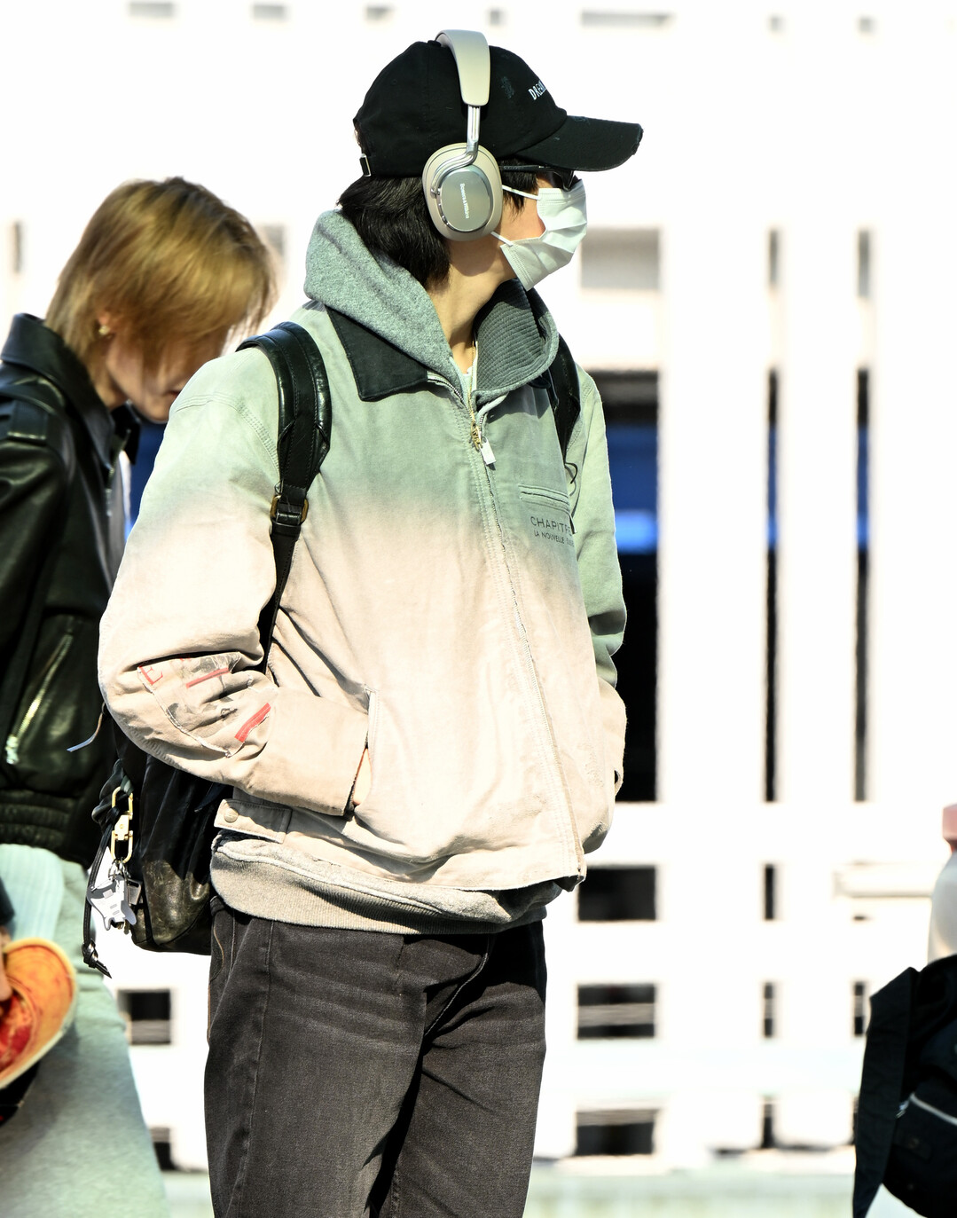 하의로는 블랙 컬러의 와이드 팬츠를 매치해 상의의 밝은 톤과 대비를 이뤘다. 여유로운 실루엣의 팬츠는 장시간 비행을 대비한 실용적인 선택으로 보이며, 블랙 슈즈를 신어 하의와 통일감을 주었다. 블랙 백팩을 메고 실버 헤드폰을 착용해 음악을 즐기며 이동하는 자연스러운 모습을 연출했다. 'DREAM WITH ME'라는 문구가 새겨진 블랙 볼캡을 눌러 쓰고 마스크를 착용해 프라이빗한 분위기를 더했다.