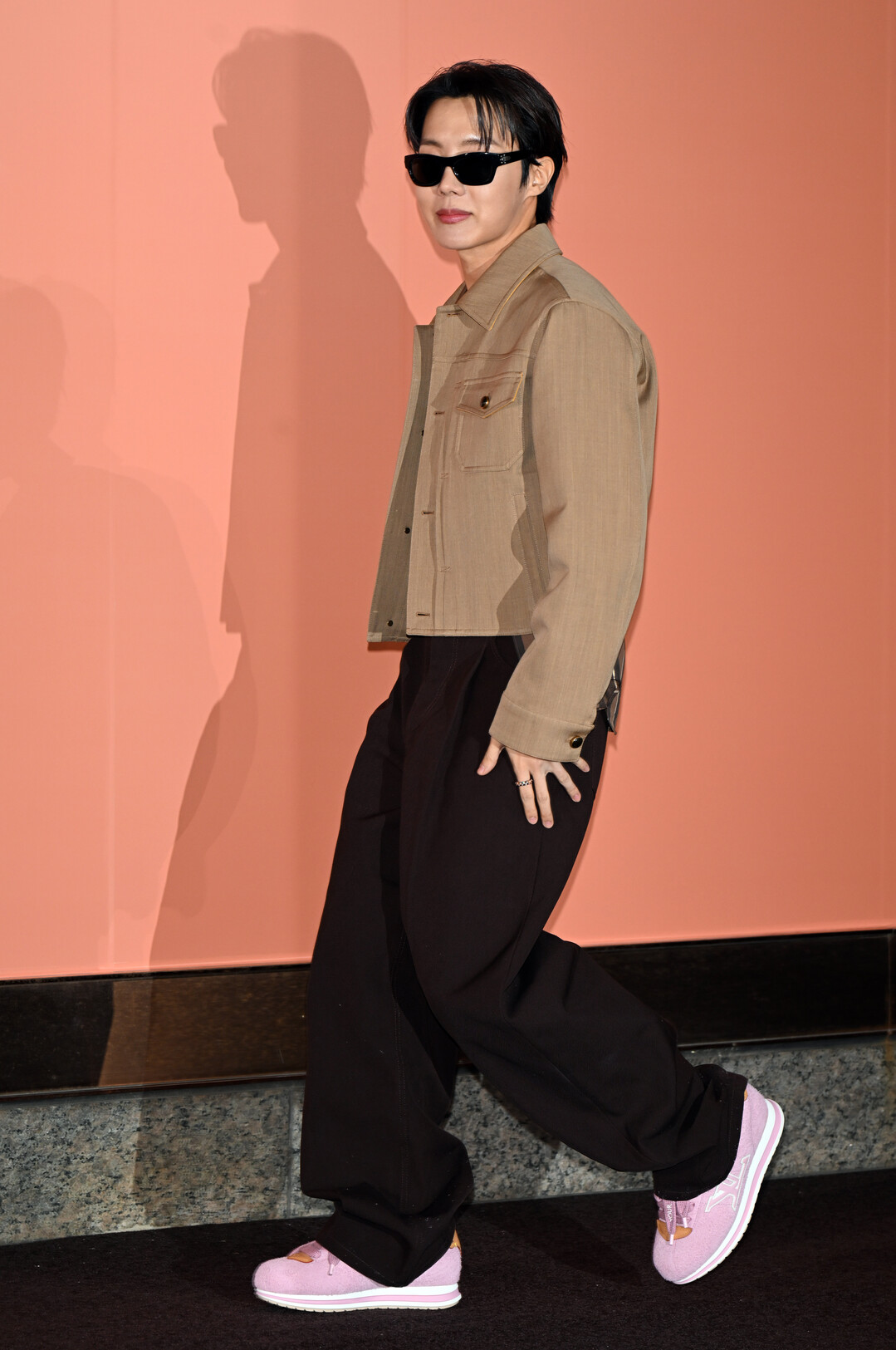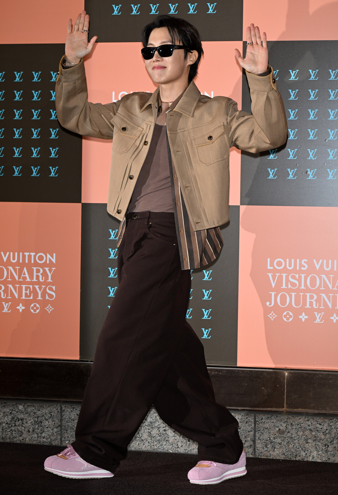 지난 3일 오후 서울 중구 신세계백화점에서 열린 '루이비통 비저너리 저니 서울' 오프닝 이벤트에 참석한 제이홉은 베이지 톤 크롭 재킷에 검은색 와이드 팬츠를 매치한 젠더리스 룩으로 등장했다. 특히 발목까지 내려오는 루즈핏 팬츠와 핑크색 스니커즈의 파격적인 조합이 눈길을 끌었다.