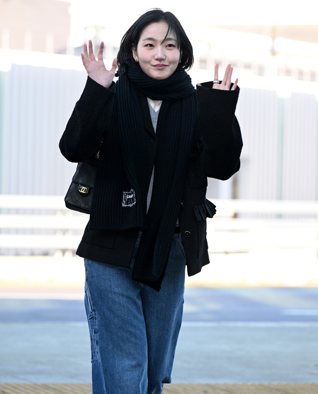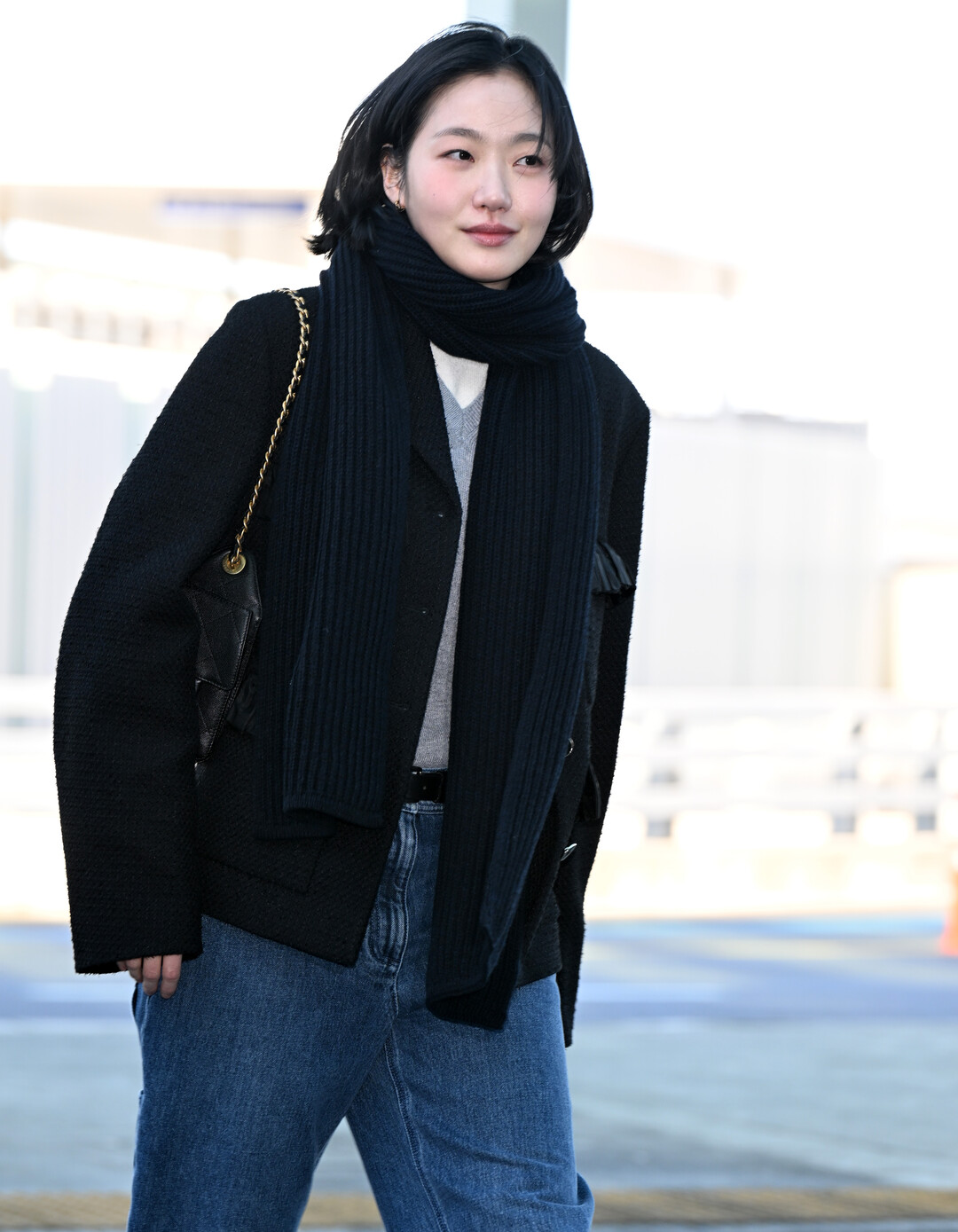 김고은의 스타일링에서 빼놓을 수 없는 것은 블랙 니트 머플러다. 두툼한 리브 조직의 롱 머플러를 목에 여러 번 감아 보온성을 확보하면서도 자연스러운 볼륨감을 연출했다. 머플러 끝단에는 샤넬 로고 패치가 부착되어 있어 브랜드와의 긴밀한 관계를 은은하게 드러냈다. 이 머플러는 단순히 방한 아이템을 넘어 전체 룩의 레이어링 포인트로 작용하며 파리지엔 특유의 시크한 분위기를 완성했다.
