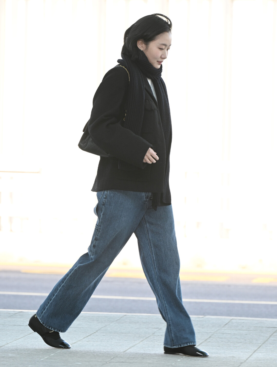 김고은은 블랙 니트 재킷을 메인 아이템으로 선택했다. 골드 체인 디테일이 어깨선을 따라 이어지는 재킷은 샤넬 특유의 정교한 테일러링을 보여주는 아이템이다. 내부에는 라이트 그레이 니트를 레이어링해 부드러운 톤 대비를 연출했다. 와이드 데님 팬츠는 편안한 실루엣으로 공항 패션의 실용성을 더했으며, 블랙 포인티드 토 슈즈로 세련된 마무리를 완성했다.