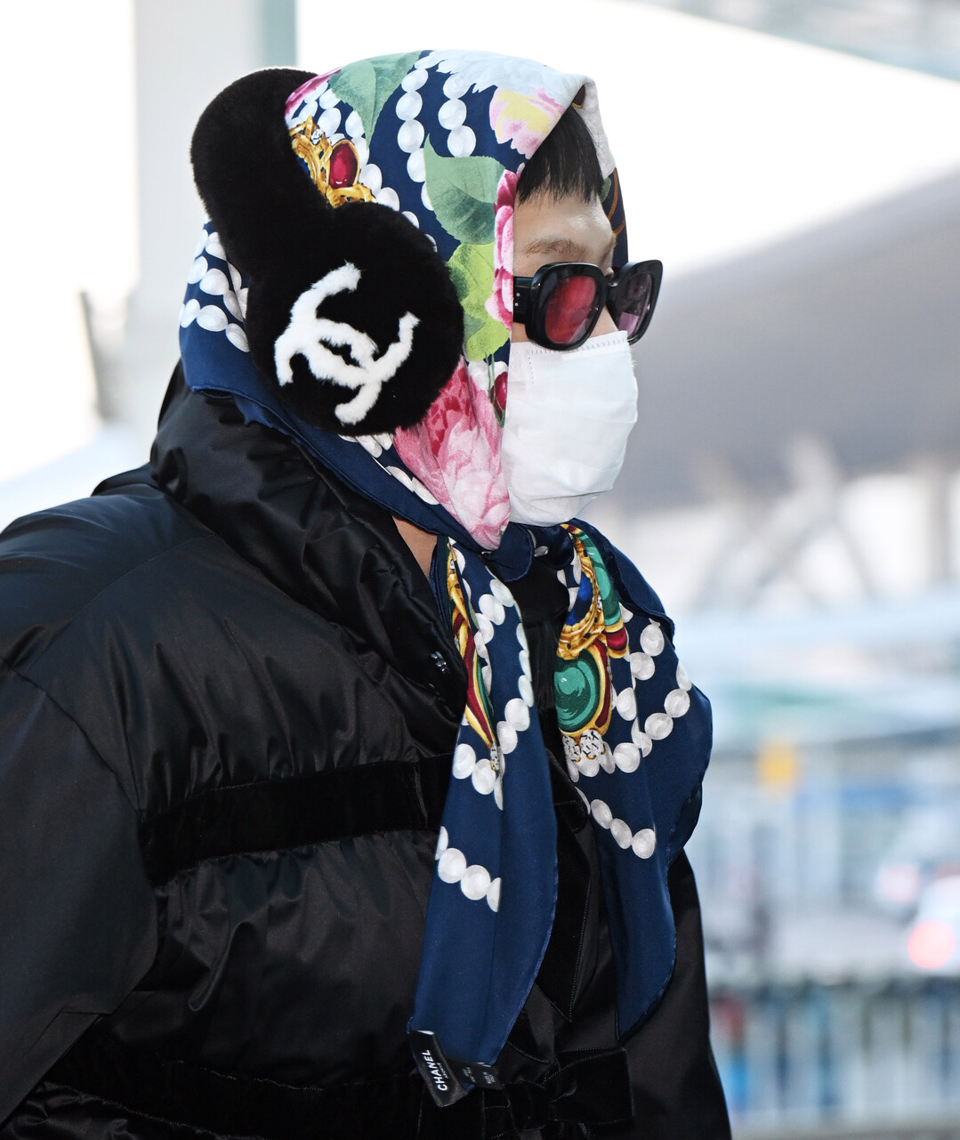 여기에 네이비 베이스에 화려한 플로럴 패턴과 펄 장식이 돋보이는 샤넬 실크 스카프를 두건처럼 머리에 두르고 목까지 감아 독특한 레이어링을 연출했다. 스카프에는 샤넬의 더블 C 로고가 장식되어 있어 브랜드 정체성을 명확히 드러냈다.
