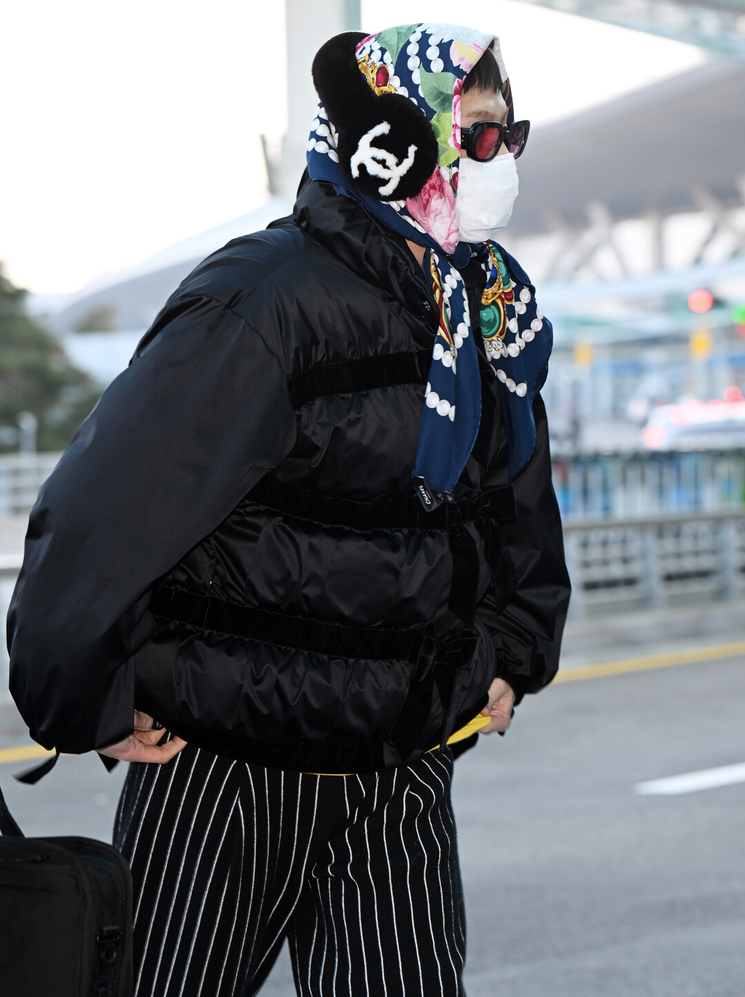 액세서리로는 골드 체인 스트랩이 돋보이는 샤넬 클래식 퀼팅백을 메고, 붉은 렌즈의 오버사이즈 선글라스를 착용해 미스터리한 분위기를 연출했다. 화이트 마스크 착용으로 얼굴 대부분을 가렸음에도 불구하고, 시선을 사로잡는 스타일링으로 공항 패션의 정수를 보여줬다.