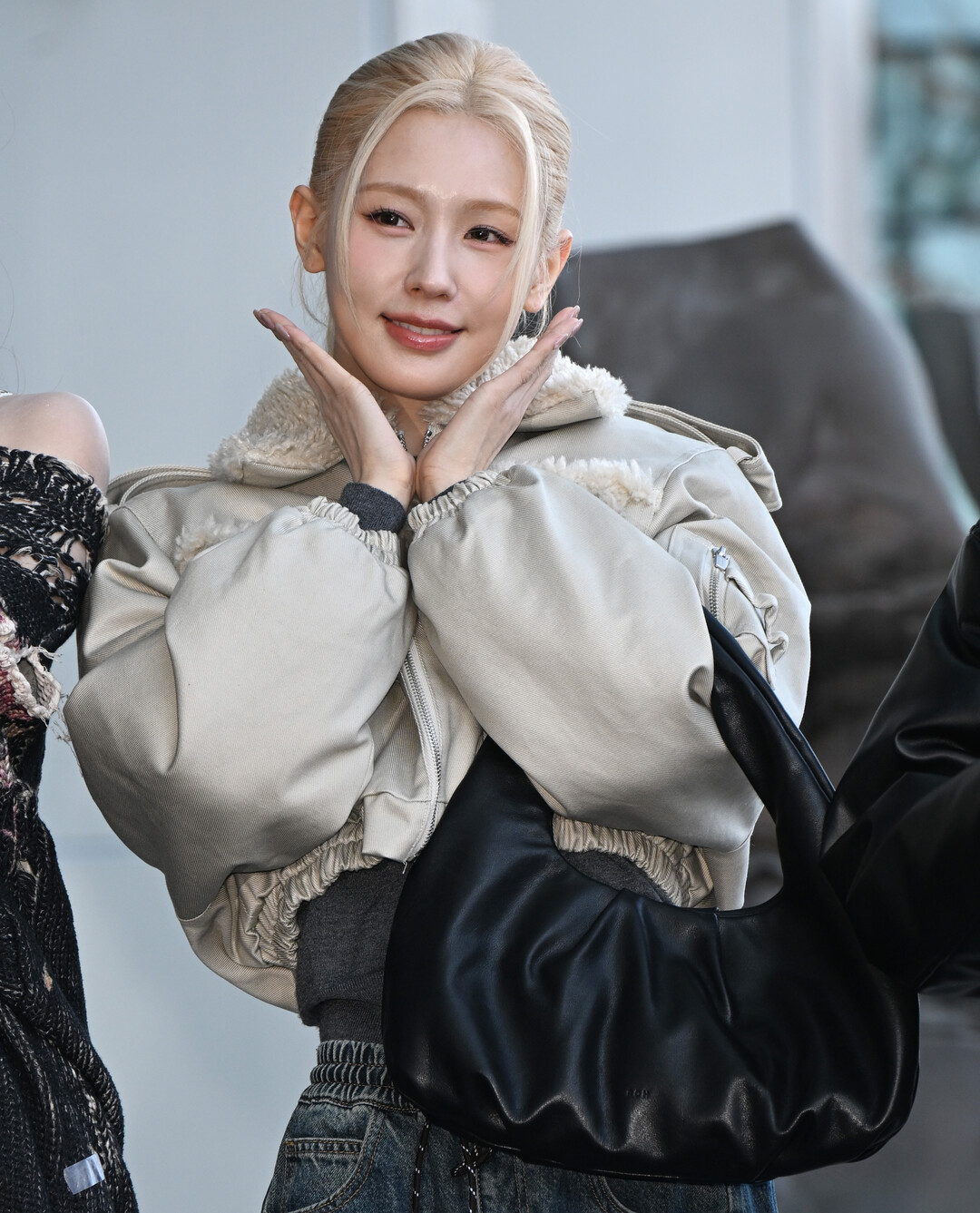 미연은 이날 베이지 톤 무스탕 크롭 재킷에 블랙 크롭티, 와이드 데님 팬츠, 블랙 캔버스 스니커즈를 매치한 캐주얼 스타일링으로 등장했다. 특히 양털 디테일이 돋보이는 무스탕 재킷은 겨울철 따뜻함과 스타일을 동시에 잡은 아이템으로, 트렌디한 크롭 기장으로 비율을 살렸다.