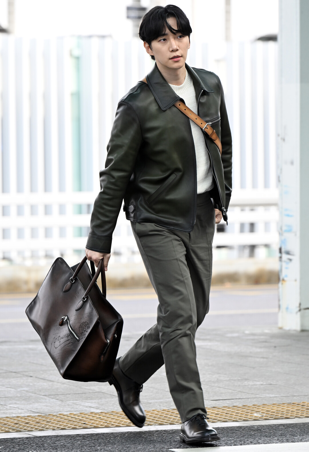 카키 레더 수트로 완성한 밀리터리 시크