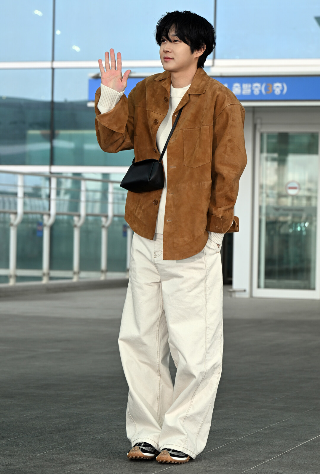 최우식의 공항 패션에서 눈에 띄는 것은 미니멀한 액세서리 선택이다. 블랙 레더 크로스바디 백은 가슴 높이에 착용해 실용성과 스타일을 겸비했으며, 과하지 않은 사이즈로 전체 룩의 밸런스를 유지했다.