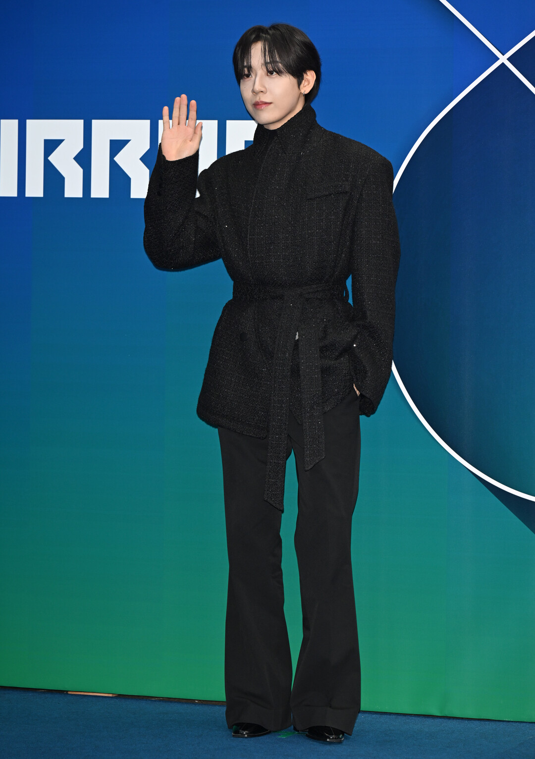 허성범은 이날 블랙 글리터 소재의 하이넥 벨티드 재킷을 메인 아이템으로 선택했다. 미세한 라메 입자가 빛을 받아 은은하게 반짝이는 이 재킷은 하이넥 디자인과 벨트 디테일로 구조적인 실루엣을 완성했다. 특히 소매 끝단의 화이트 버튼 디테일이 포인트로 작용하며 디자인의 완성도를 높였다.
