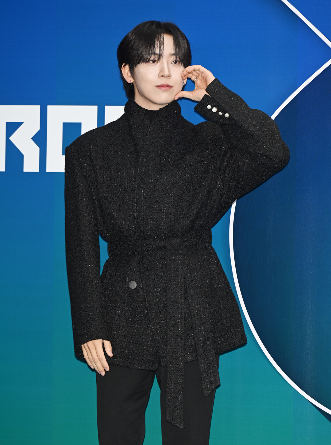 허성범은 재킷 안에 심플한 블랙 톱을 레이어드하고, 하의는 블랙 플레어 팬츠로 연출해 레트로 감성을 더했다. 발끝까지 블랙으로 통일한 모노톤 룩은 절제된 우아함과 동시에 강렬한 인상을 자아냈다. 액세서리는 귀에 착용한 실버 이어링만으로 절제미를 살렸다.