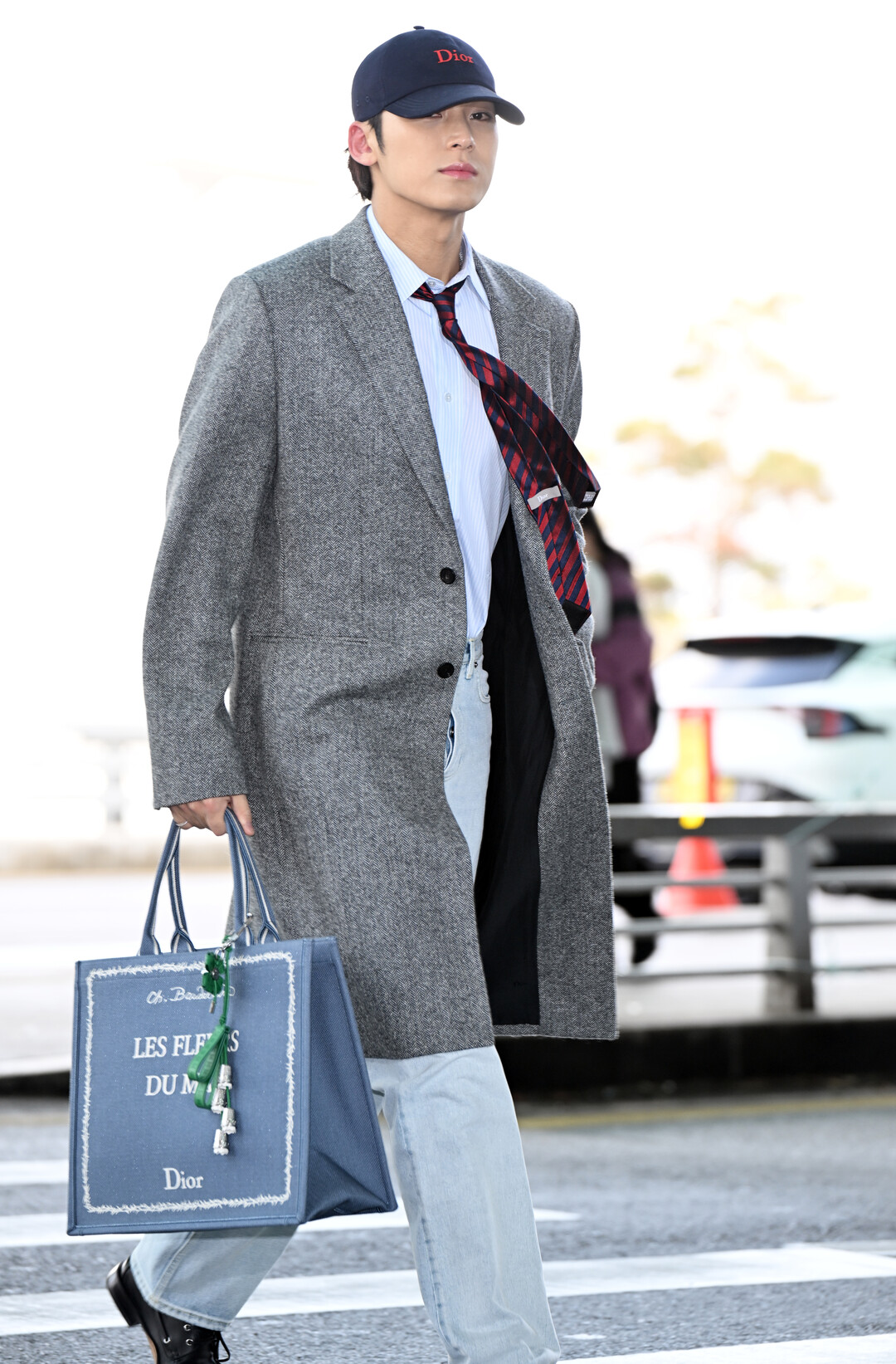 민규의 공항 패션에서 가장 눈에 띄는 것은 디올 시그니처 아이템들이다. 머리에는 네이비 컬러의 디올 로고 캡을 착용해 캐주얼함을 더했으며, 손에는 디올의 아이코닉한 북 토트백을 들었다. 네이비 컬러의 이 백은 프론트에 화이트 스티치로 프랑스를 대표하는 시인 샤를 보들레르(Charles Baudelaire)의 시집 제목 'LES FLEURS DU MAL(악의 꽃)' 텍스트가 새겨져 있으며, 그린 컬러의 참 장식이 포인트를 더했다.