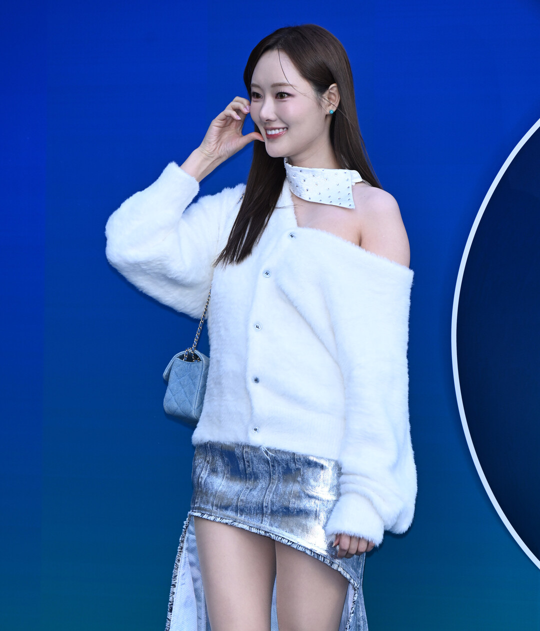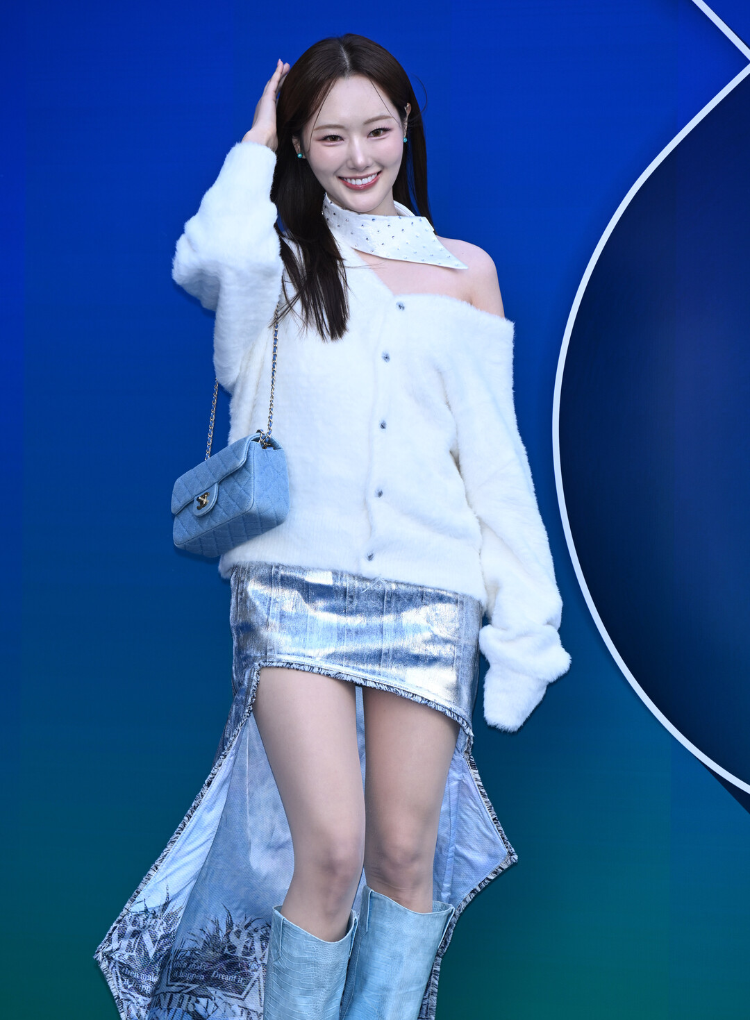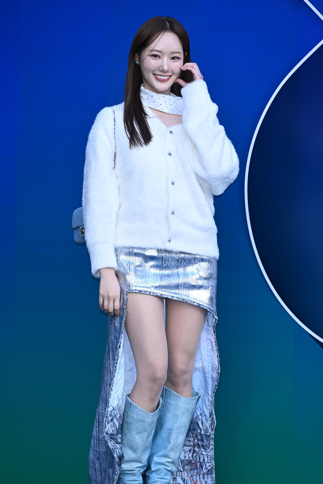 손지영이 선택한 워싱 처리된 데님 미니스커트는 앞면의 미니멀한 디자인과 달리 뒷면에 프린지와 그래픽 디테일이 더해져 독특한 시각적 효과를 연출했다. 스커트와 동일한 톤의 스카이블루 니하이부츠는 다리 라인을 한층 더 길어 보이게 하는 효과를 주며, 전체적인 룩에 조화로운 통일감을 부여했다. 화이트와 라이트 블루로 이어지는 컬러 그라데이션은 청순하면서도 세련된 이미지를 완성했다.