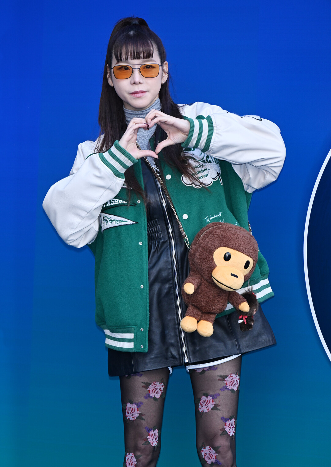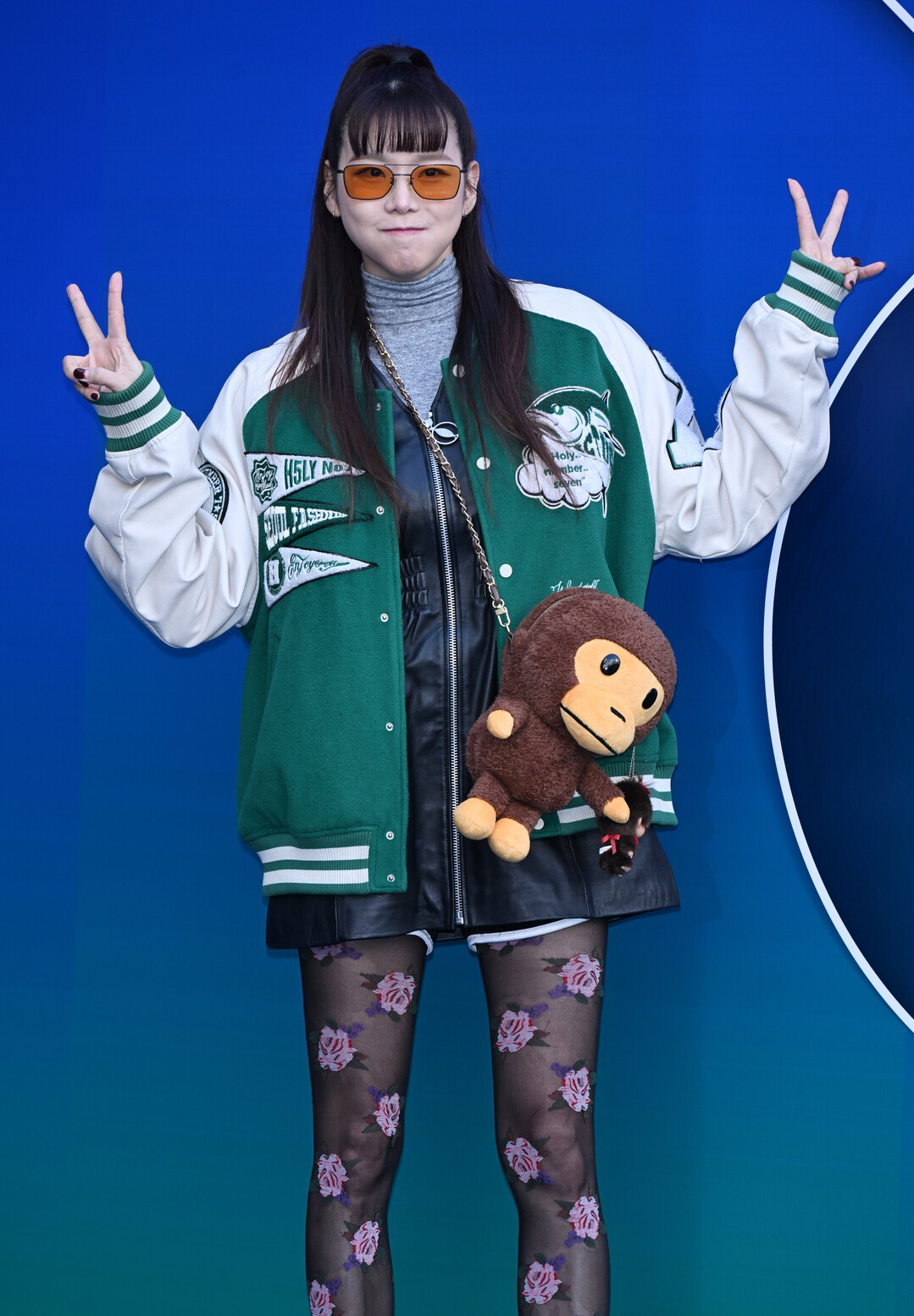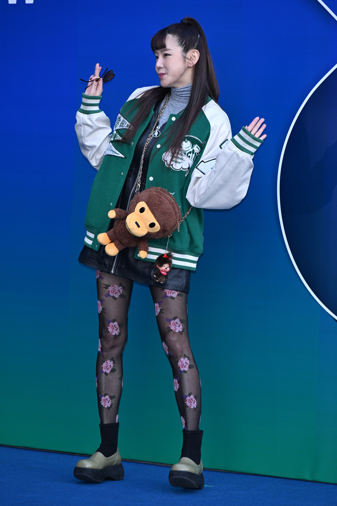 정하은이 선택한 블랙 시스루 스타킹은 핑크 플로럴 패턴이 프린트되어 있어 전체적으로 강렬한 룩에 페미닌한 디테일을 더했다. 올리브 컬러의 플랫폼 슈즈는 Y2K 무드를 극대화하며, 발목 부분의 블랙 양말 레이어링이 룩의 완성도를 높였다. 체인 스트랩이 달린 원숭이 인형 크로스백은 장난기 넘치는 포인트 아이템으로 작용했다.